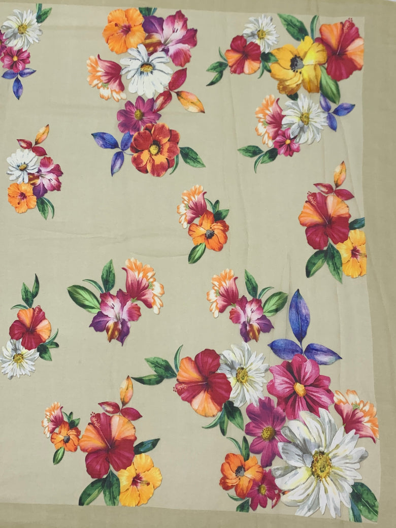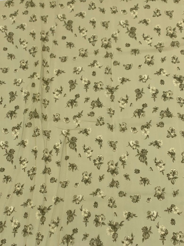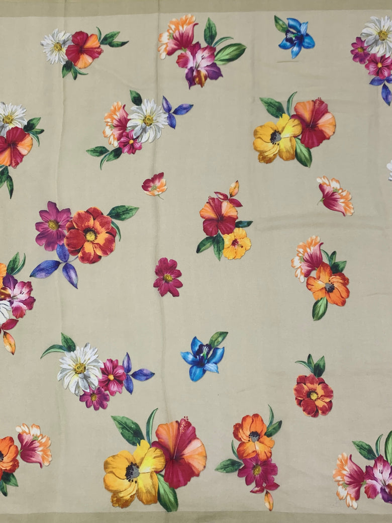 This light olive-green chiffon saree features an all-over digital floral print with a self plain small border and pallu. It includes a matching blouse adorned with the same floral design, offering a graceful and elegant look.