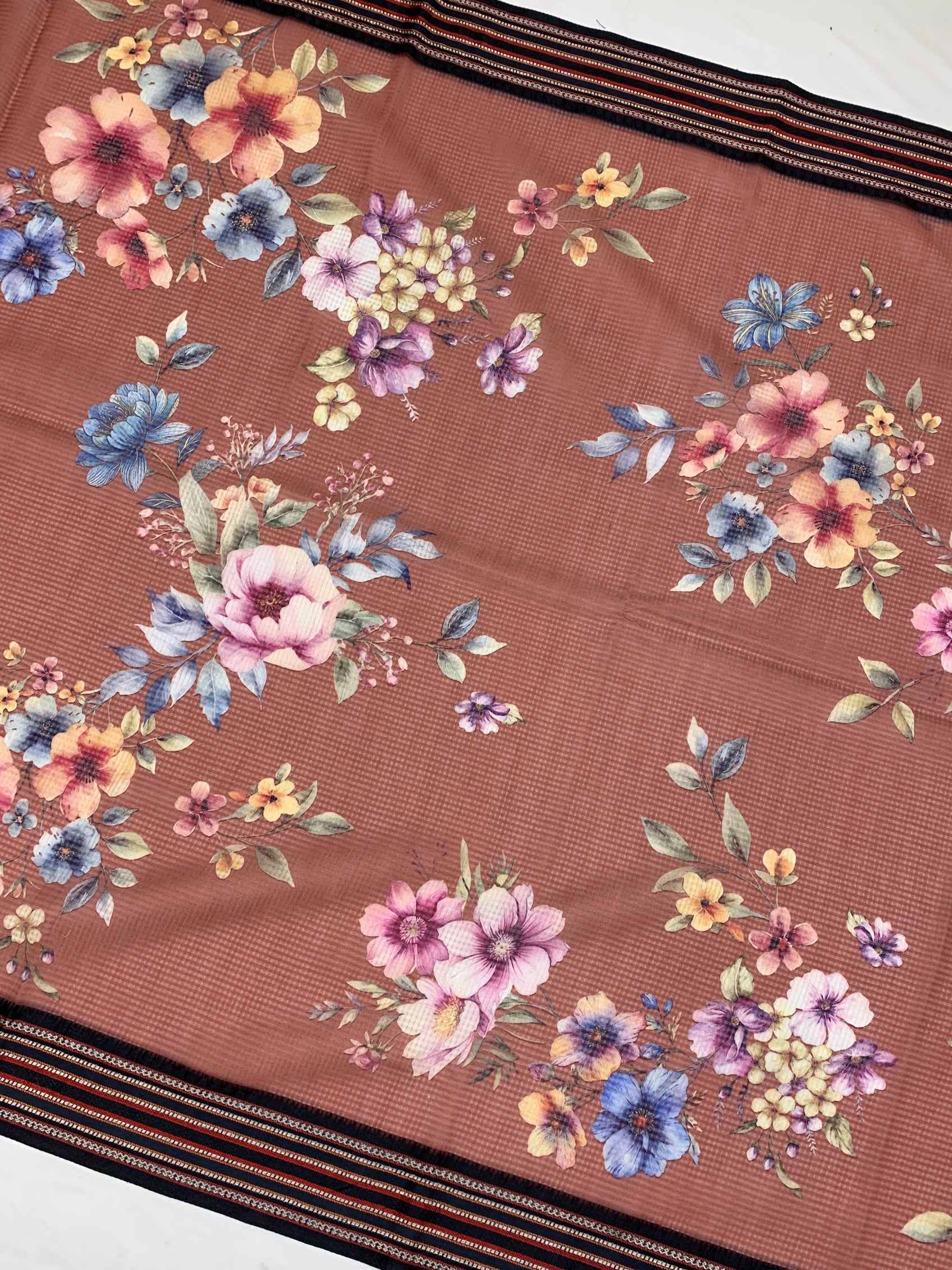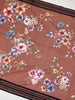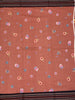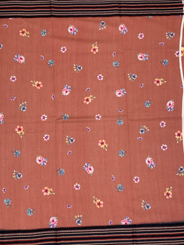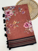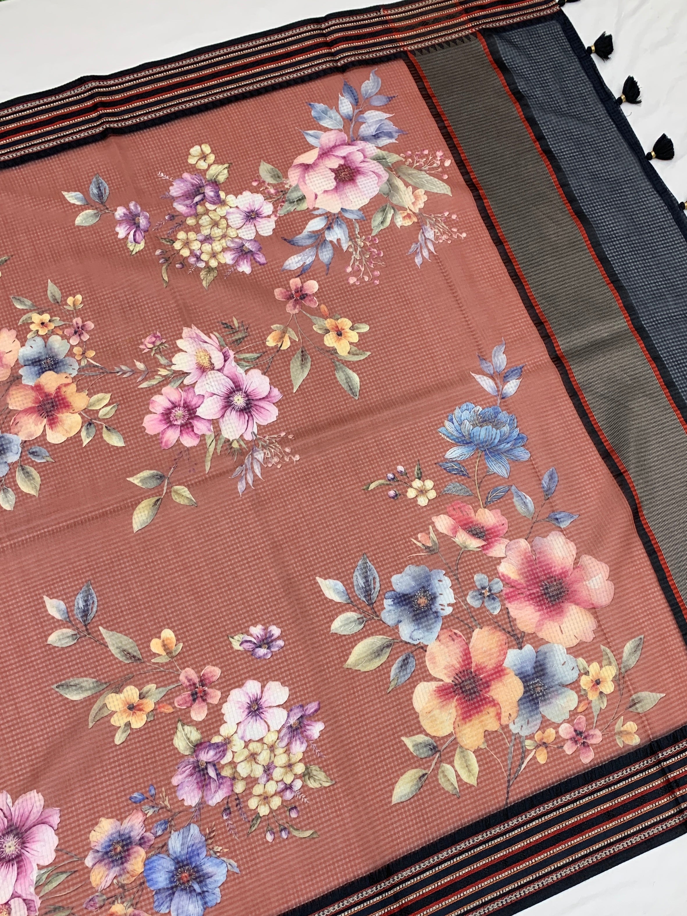 Brown cotton kota saree features an all-over floral print, complemented by a contrasting black thread-woven Vidarbha border and a pallu adorned with zari stripes. The blouse is self floral printed with a coordinating border, completing the sophisticated look.