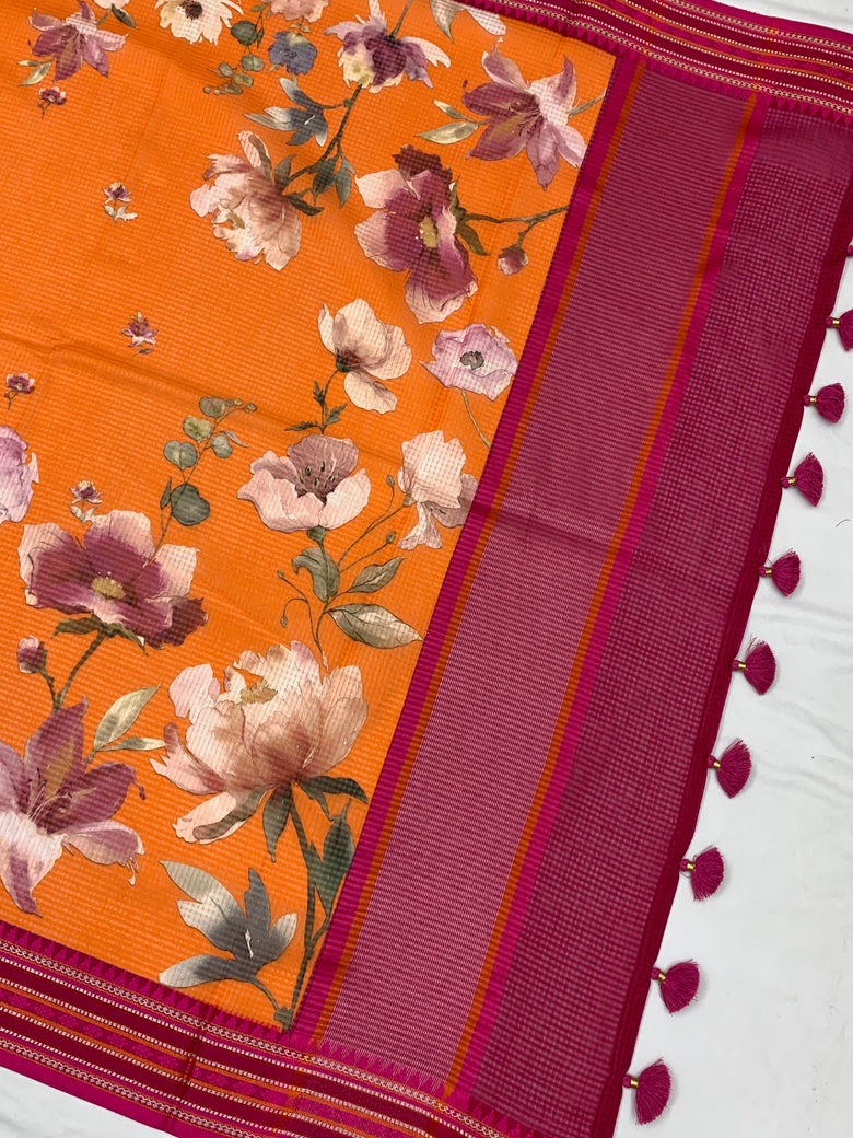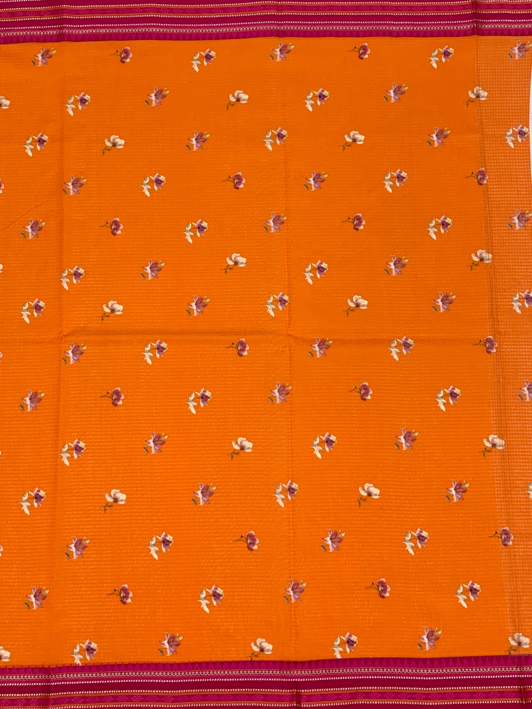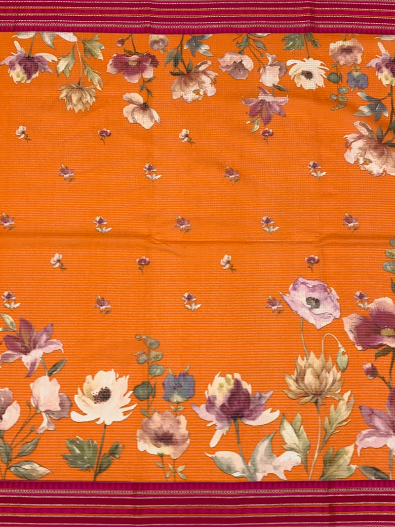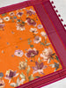 This cotton kota saree features an exquisite all-over floral pattern, enhanced by a classic Vidarbha traditional border and a sophisticated self-designed pallu. Its rich orange hue contributes to its enduring charm, perfectly complemented by a matching blouse to complete the look.