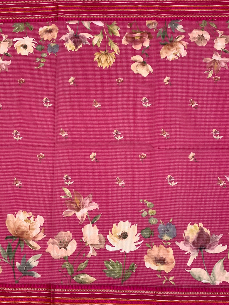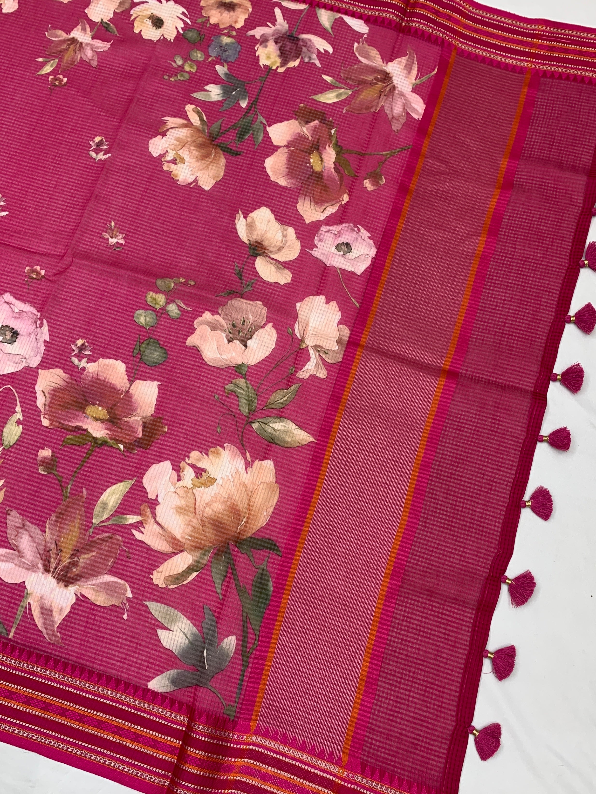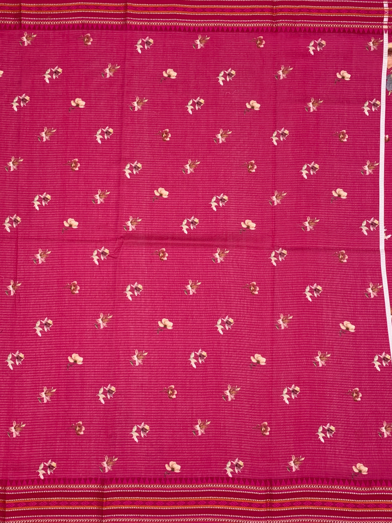This cotton Kota saree showcases an intricate all-over floral pattern, gracefully framed by a traditional Vidarbha border. Its refined self-designed pallu adds an element of sophistication, while the rich pink color enhances its timeless appeal. Paired with a matching blouse.