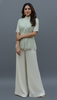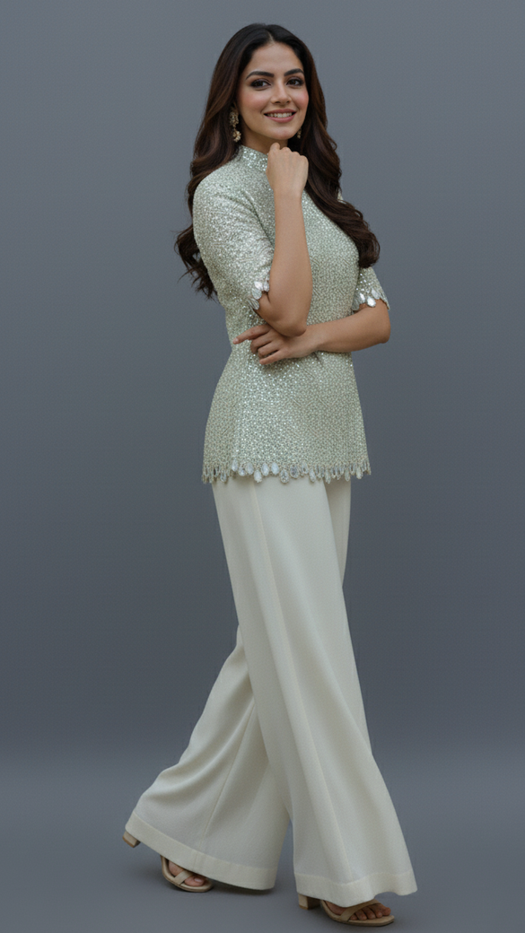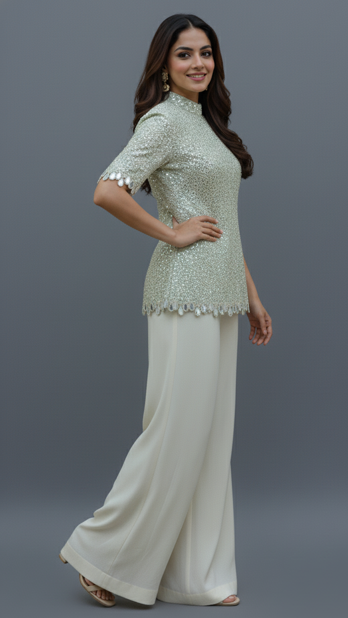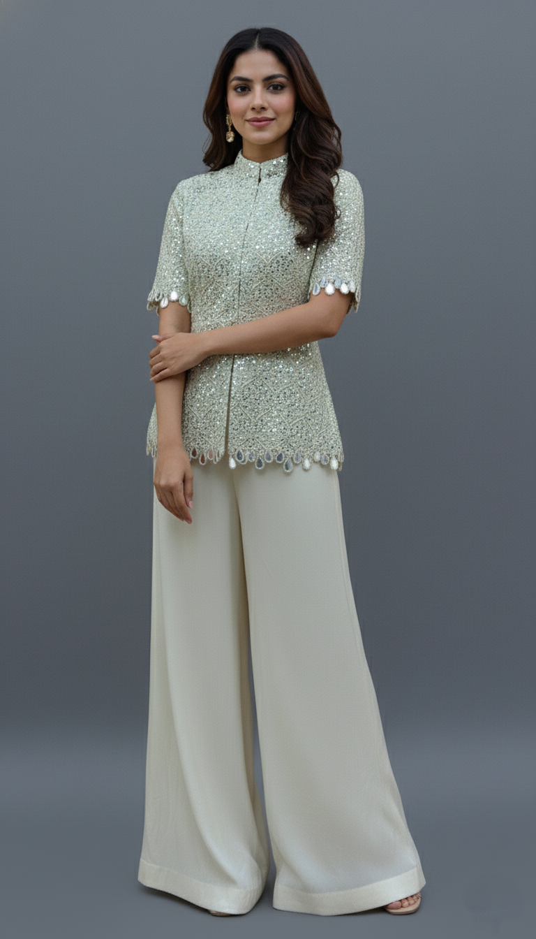 This co-ord set features a georgette fabric with intricate self thread and sequin embellishments in a floral embroidery pattern on the top, paired with a simple, plain bottom made of crepe fabric.