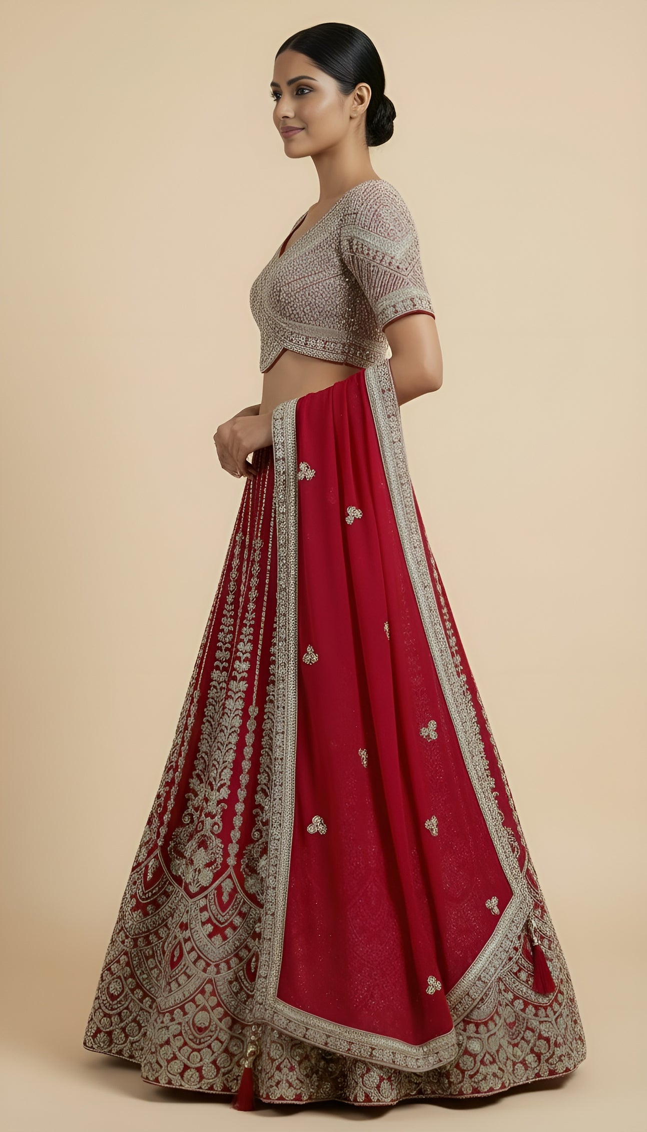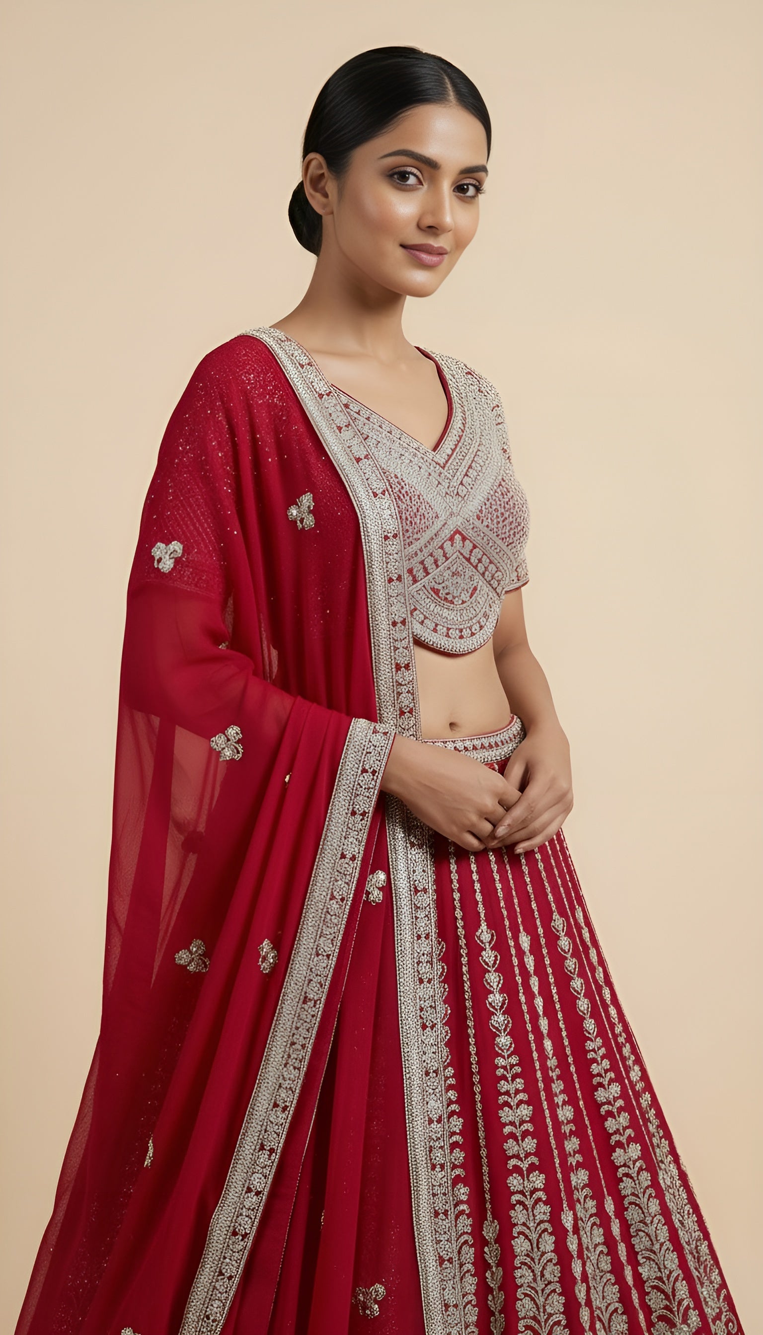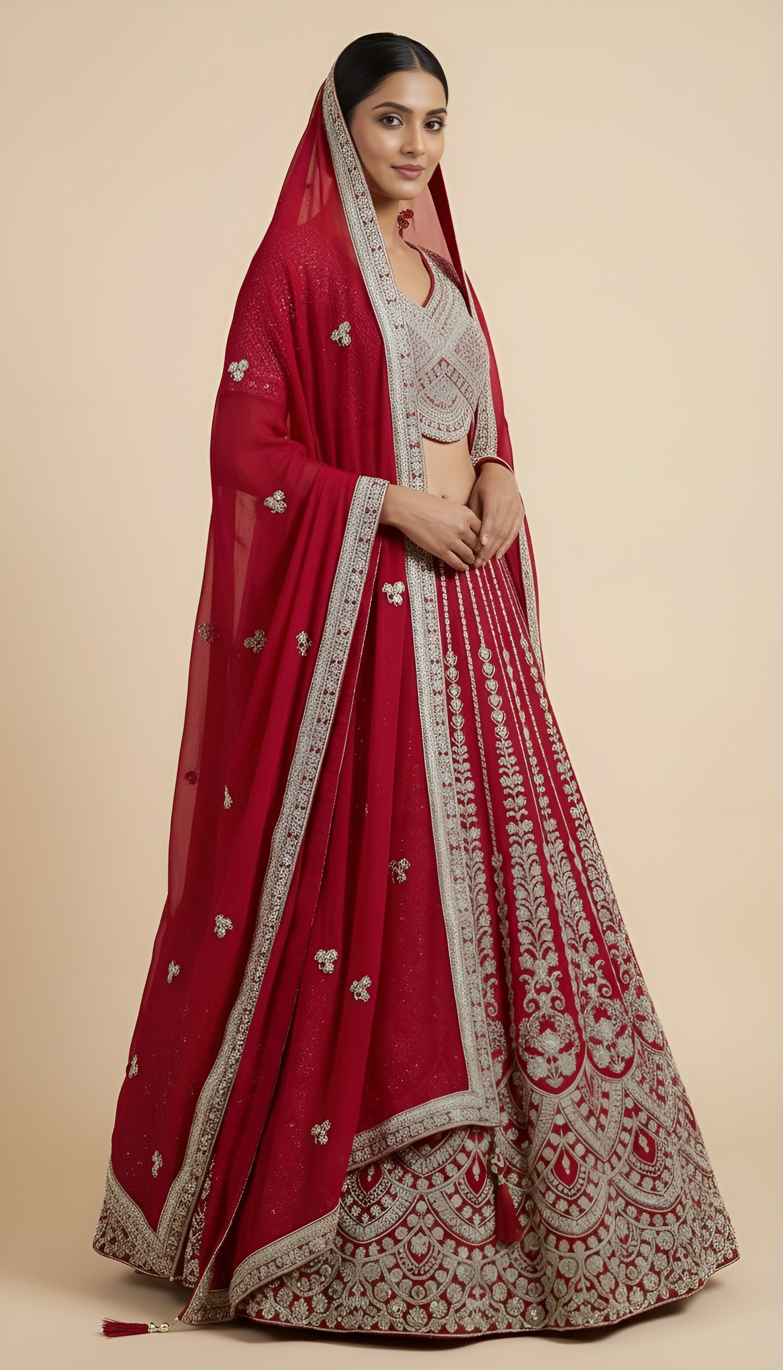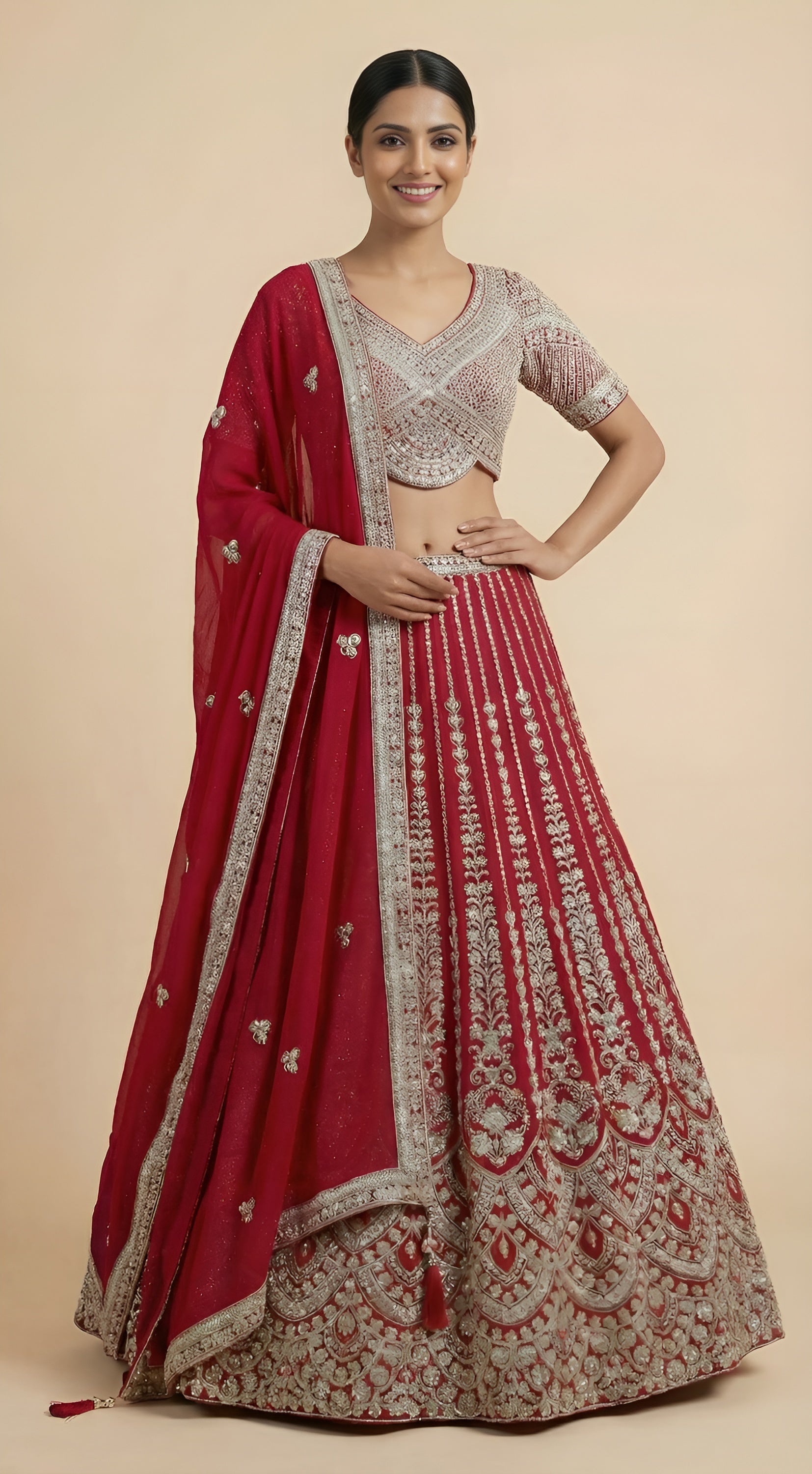 Georgette lehenga in a dark-pink color features intricate thread work floral embroidery and sequence embellishments all over the fabric. The blouse also showcases self thread work floral embroidery, and the matching dupatta is adorned with a border and self floral buttis.