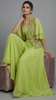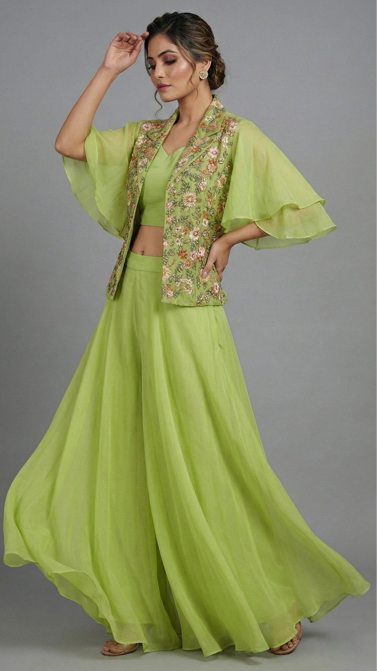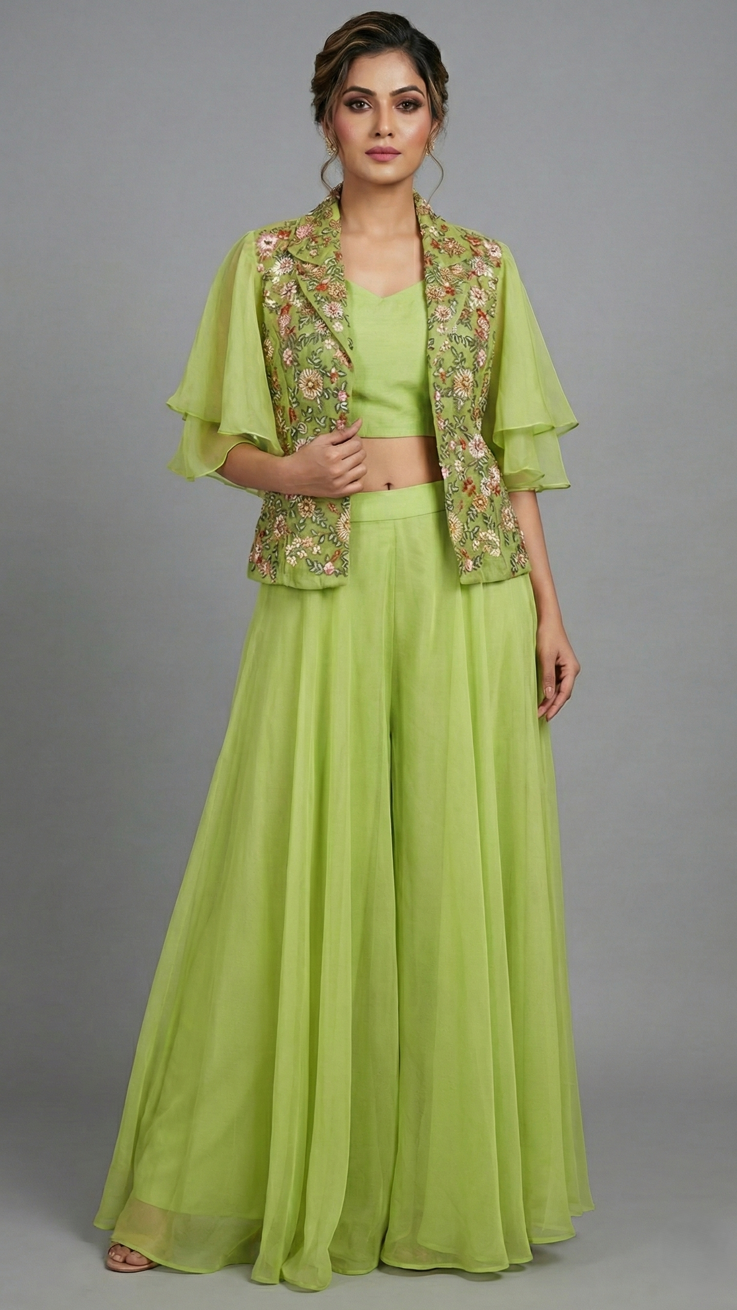 This Green Indo-Western Set is a stunning 3-piece outfit made of luxurious organza fabric. Featuring a palazzo, crop top, and jacket adorned with intricate gold, silver zari resham thread weave,sequence & Pearl work, this ensemble seamlessly combines traditional craftsmanship and modern style.