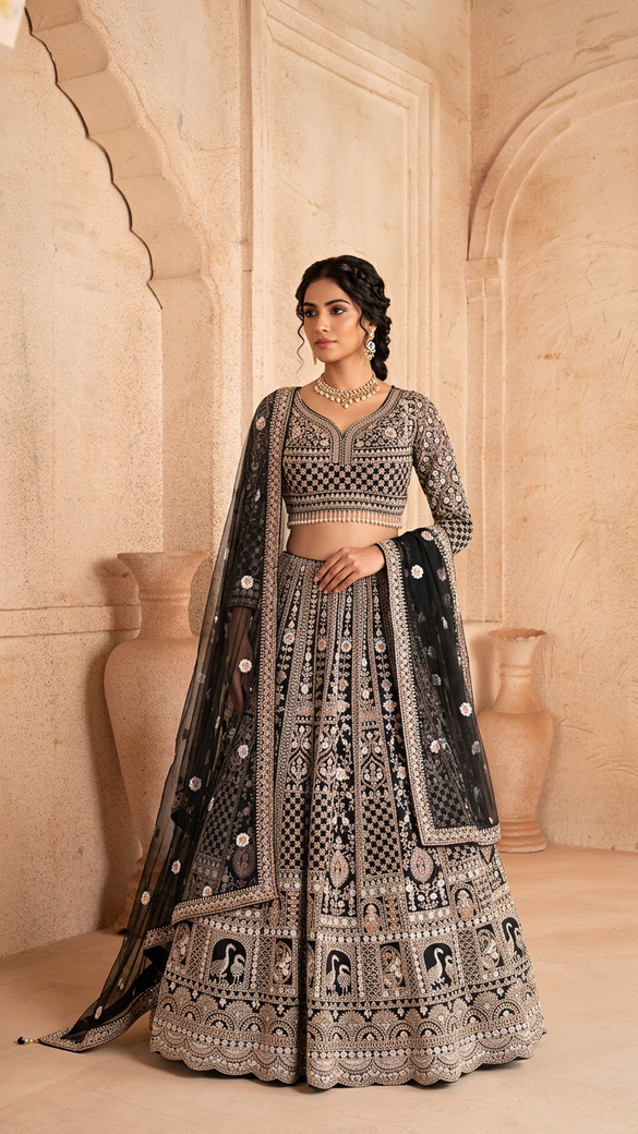 This grey lehenga set showcases a beautiful net fabric with intricate hand-embroidered floral and bird motifs. The lehenga itself is adorned with delicate sequence and thread weave embroidery, while the blouse features floral embroidery. The accompanying dupatta is made of net fabric and also features thread weave and sequence floral buttis, complete with a border.