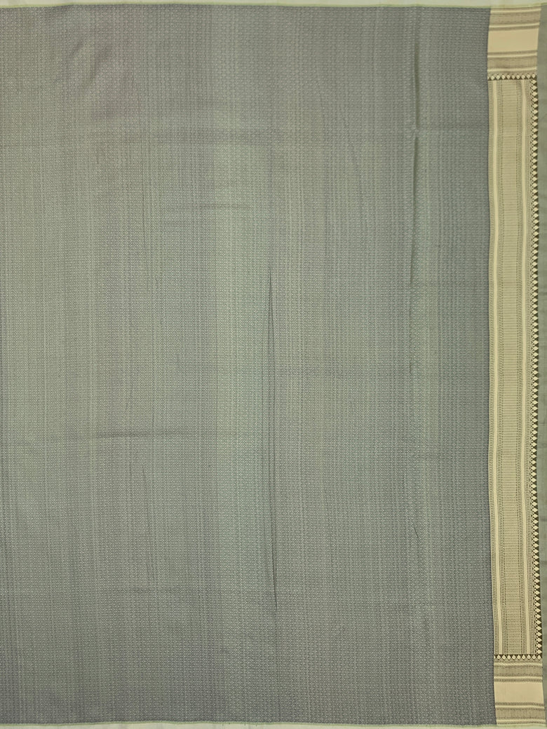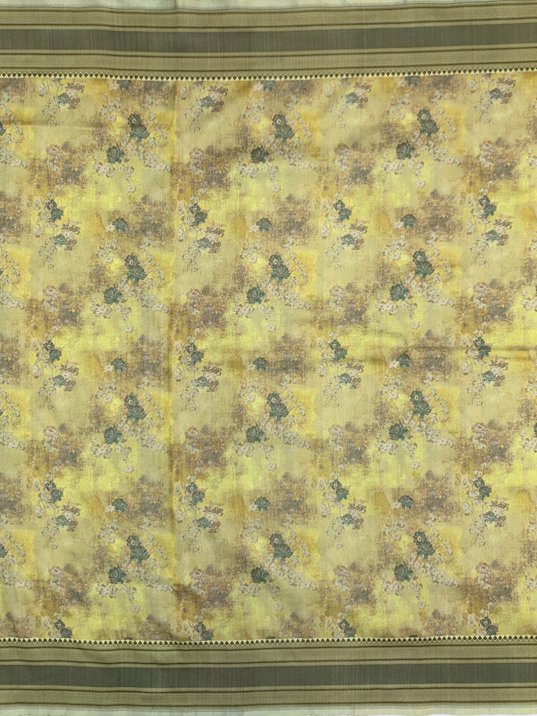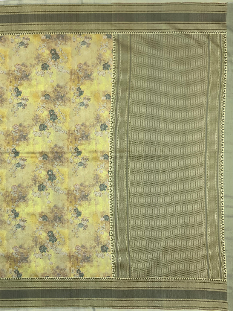 This handwoven katan silk saree features a traditional floral jaal pattern, with intricate thread weaving throughout. The contrasting brocade border and pallu add a touch of elegance to this beautiful lemon-green saree. The blouse also features a contrasting brocade pattern with a border, completing the overall look.