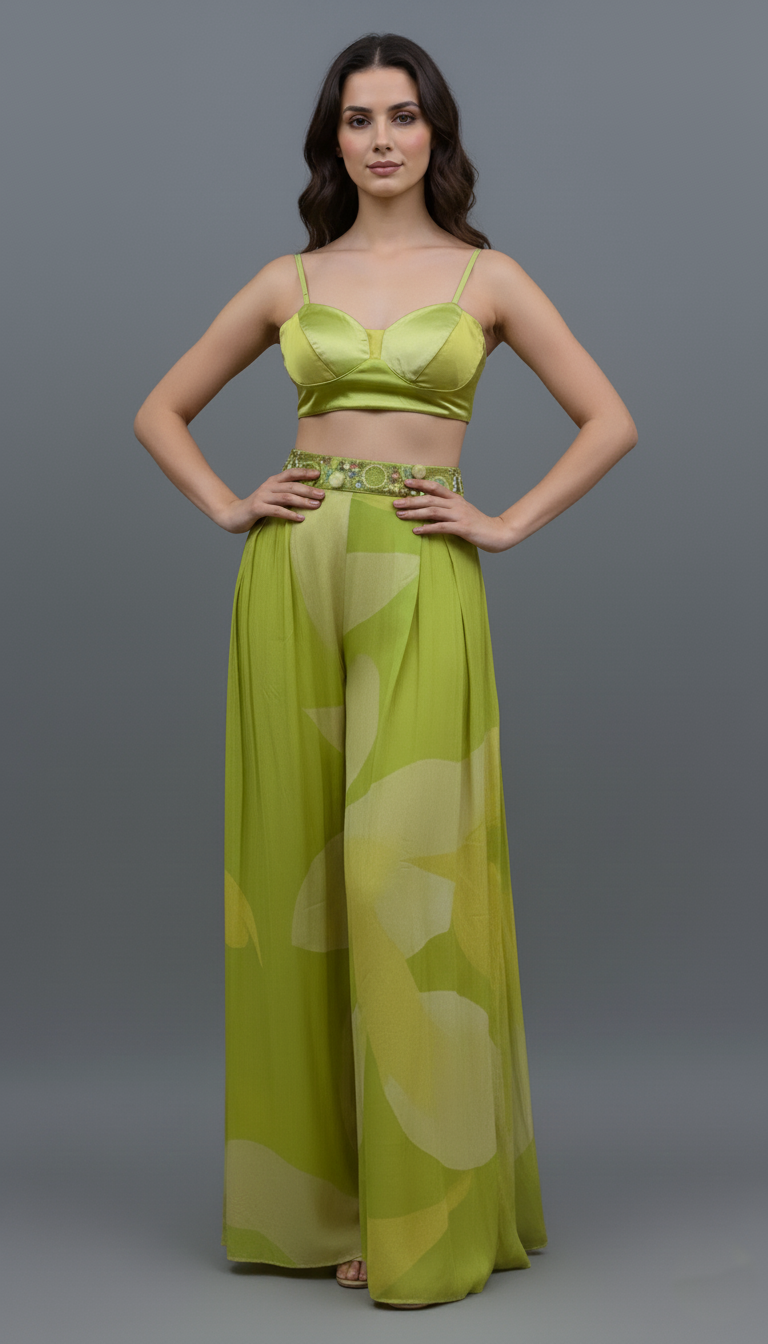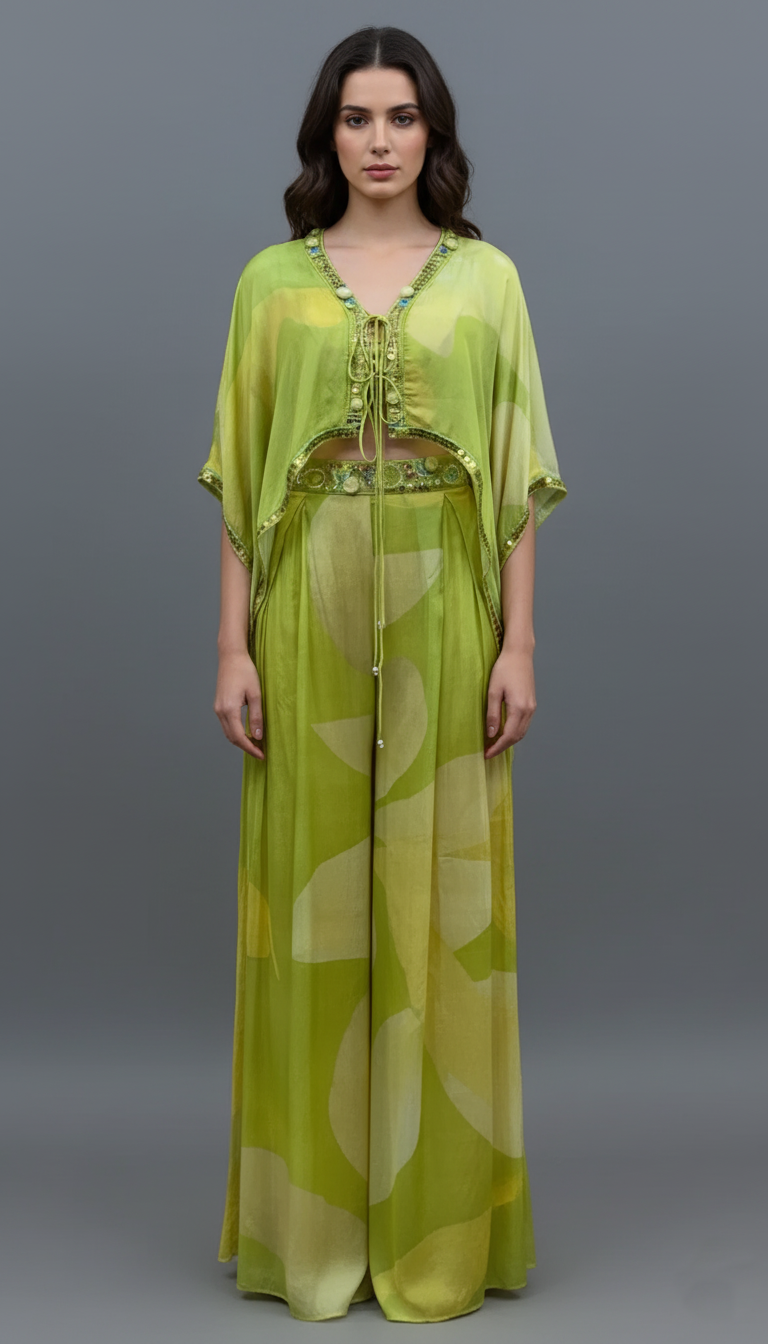The indo western cape set features a beautiful multi-color geometric print throughout the chiffon fabric, with a matching self-printed bottom. The jacket includes a self-printed design and showcases elegant floral embroidery with gold coin detailing on the neckline.
