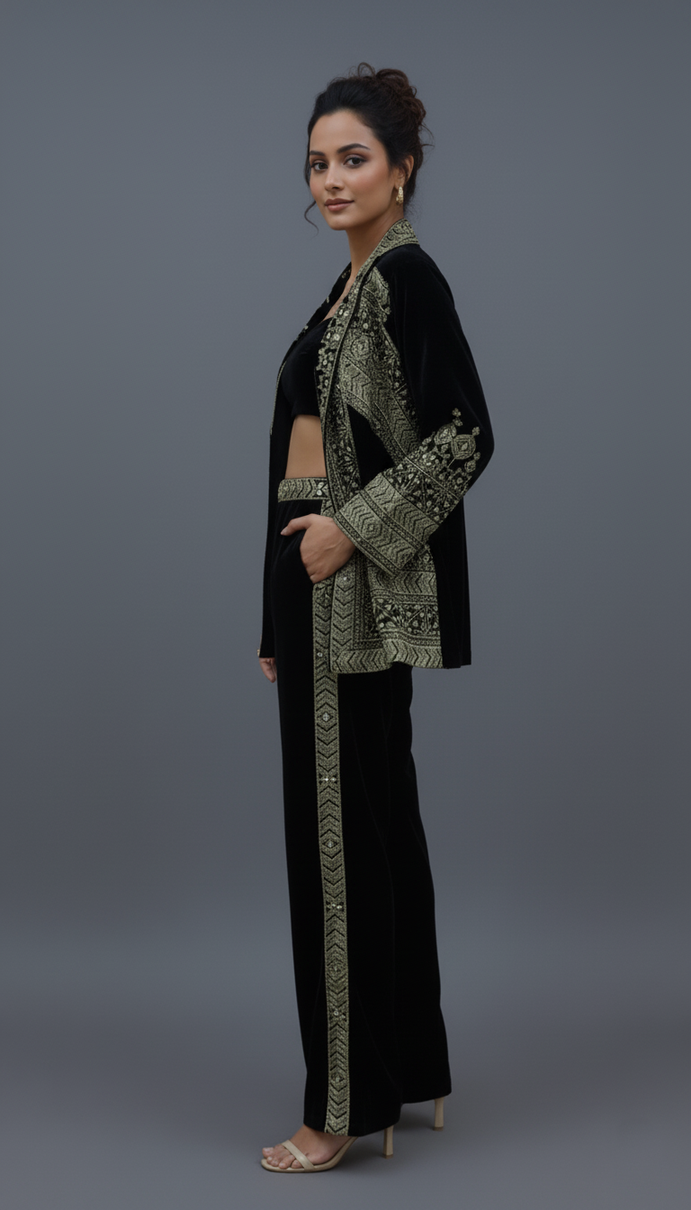 The indo western cape set is made of velvet fabric and features a self plain blouse and bottom. The jacket comes with self floral mirror and embroidery work, adding a touch of elegance to the ensemble.