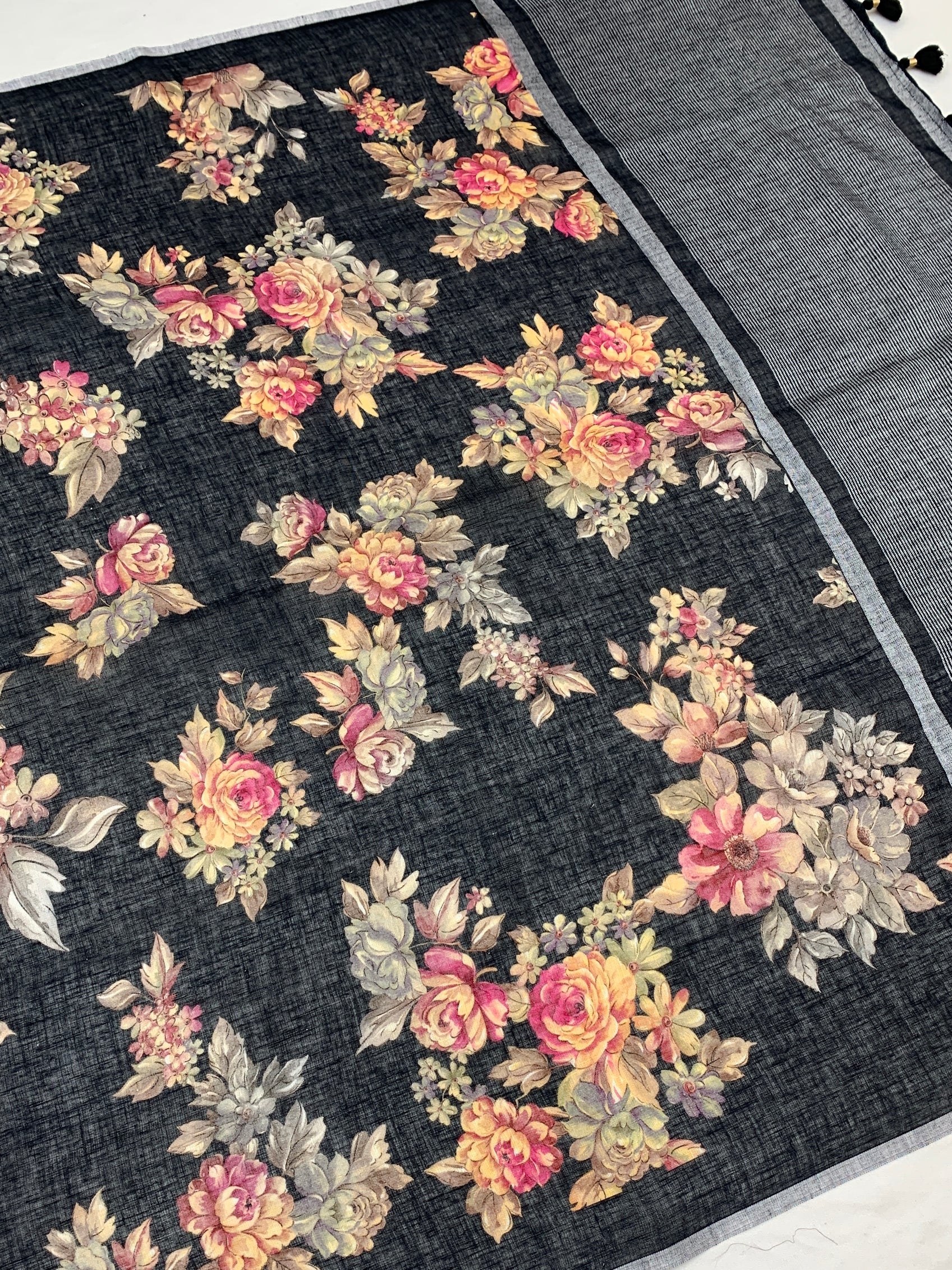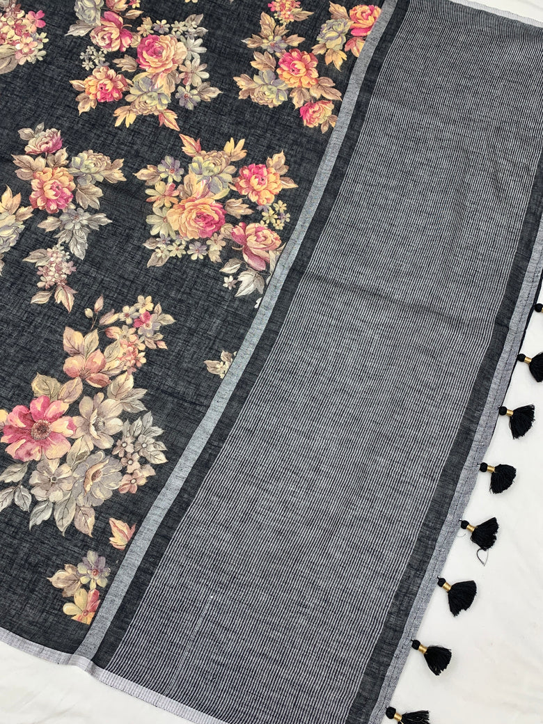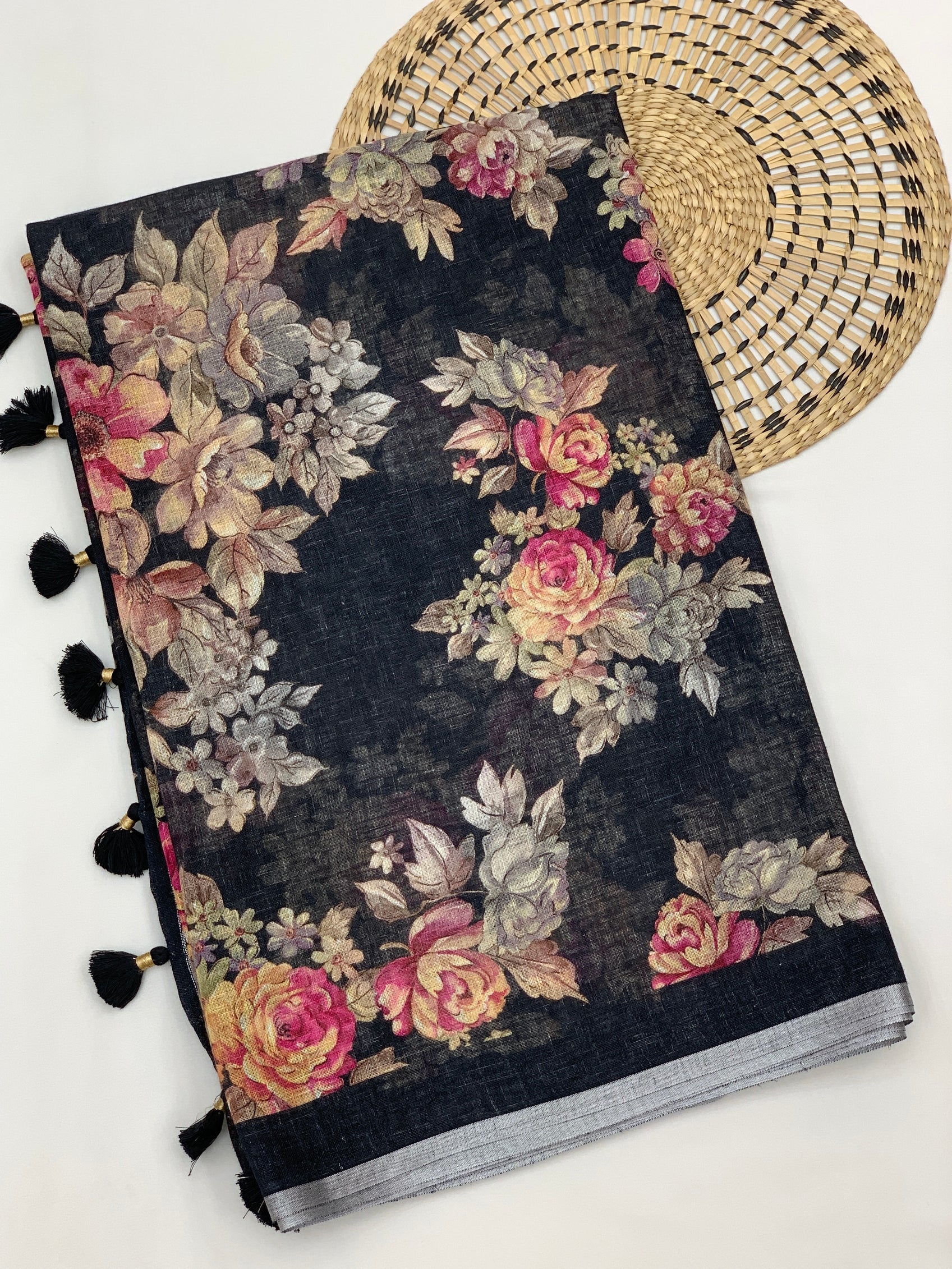 This Linen Cotton Saree in an elegant Black hue displays detailed multi-colored floral jal work. It is accentuated with a fine silver zari kaddi border and striped pallu. The coordinating blouse highlights a matching small floral motif framed by a delicate zari border.