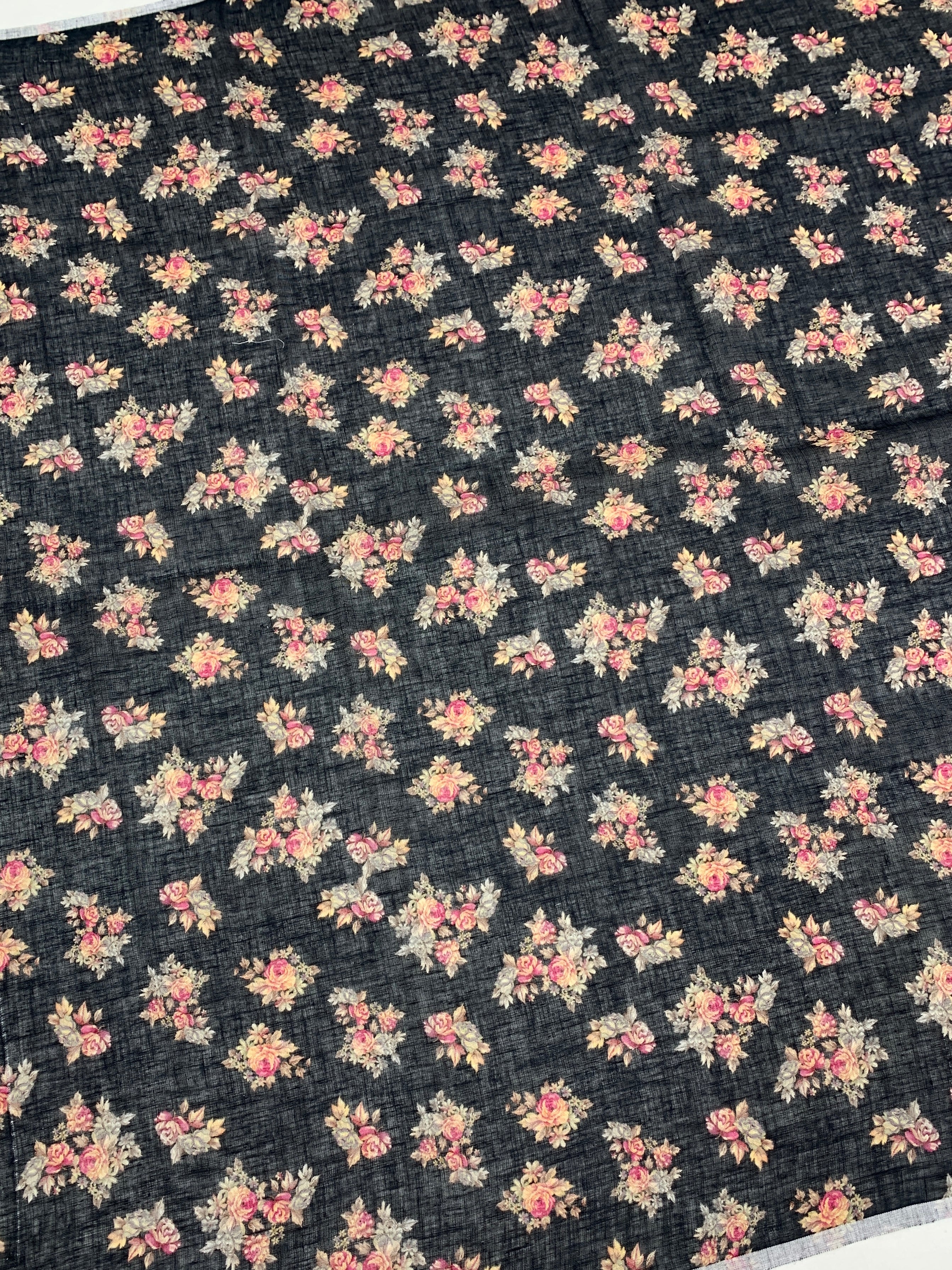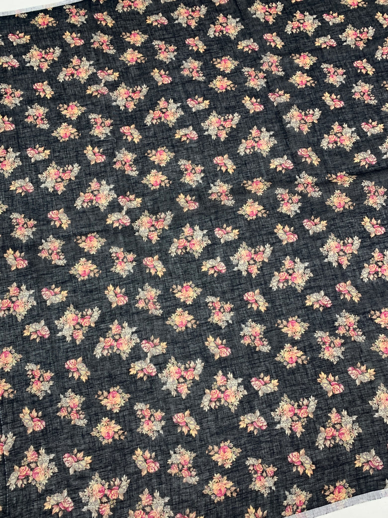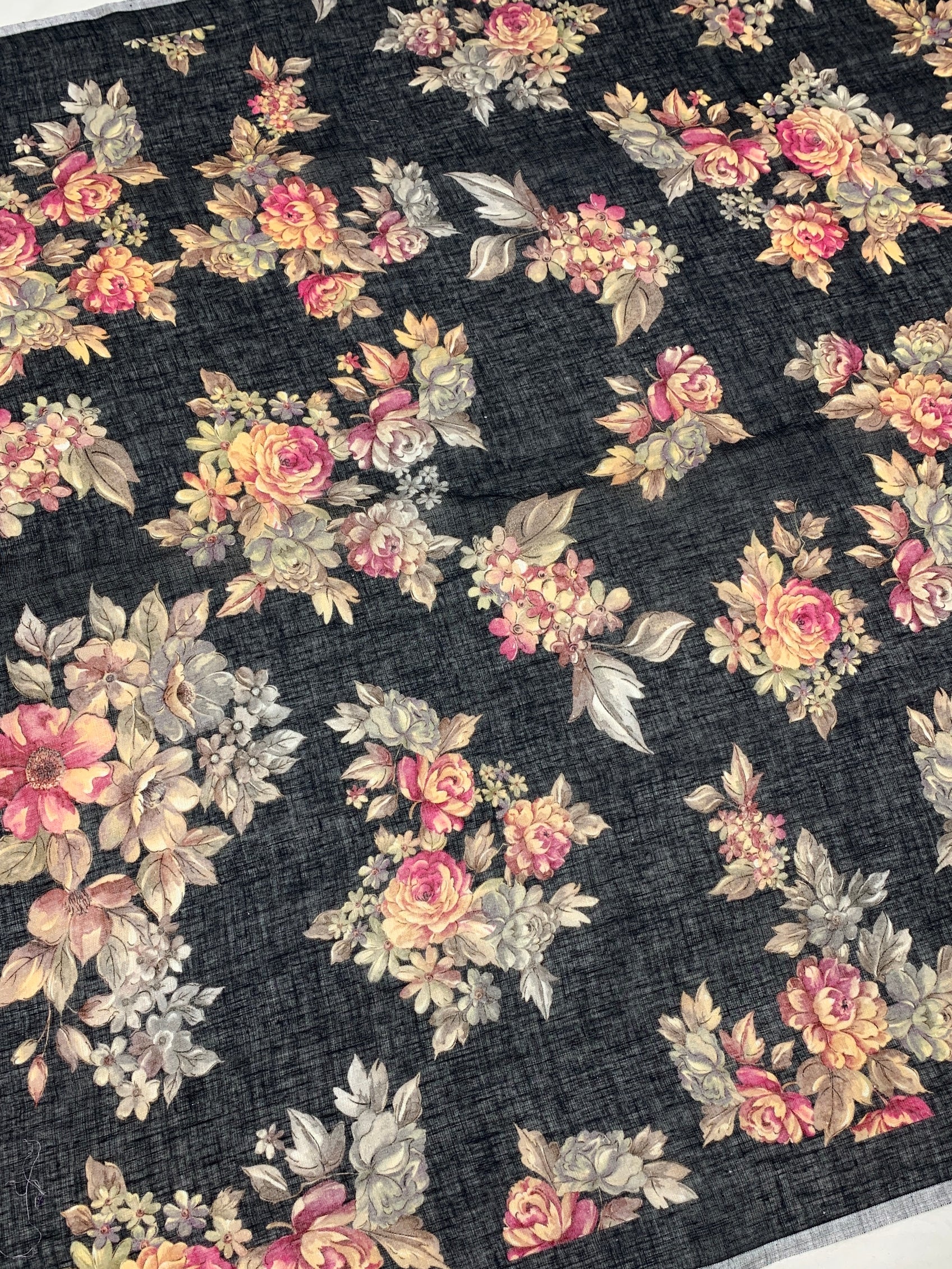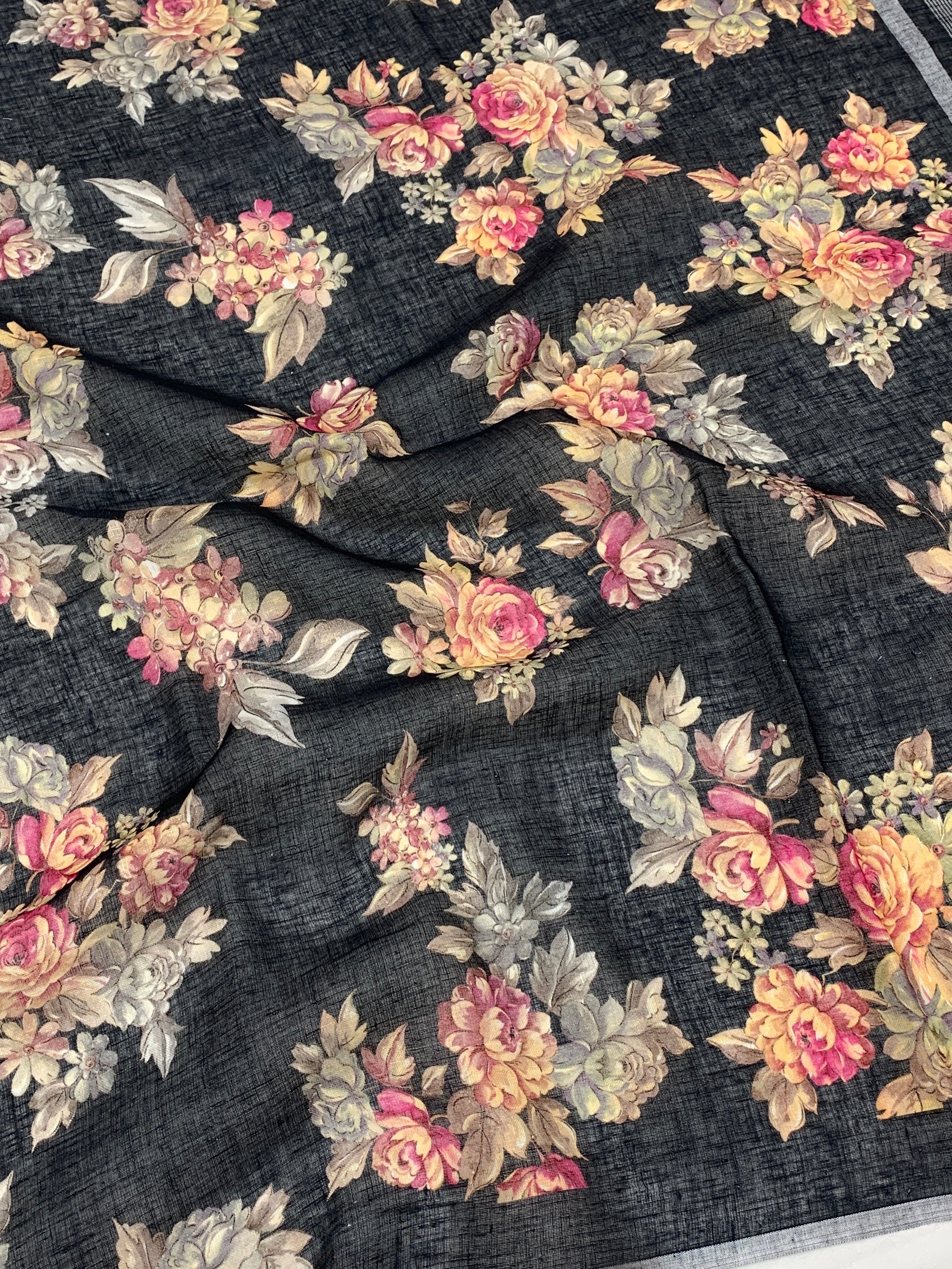 This Linen Cotton Saree in an elegant Black hue displays detailed multi-colored floral jal work. It is accentuated with a fine silver zari kaddi border and striped pallu. The coordinating blouse highlights a matching small floral motif framed by a delicate zari border.