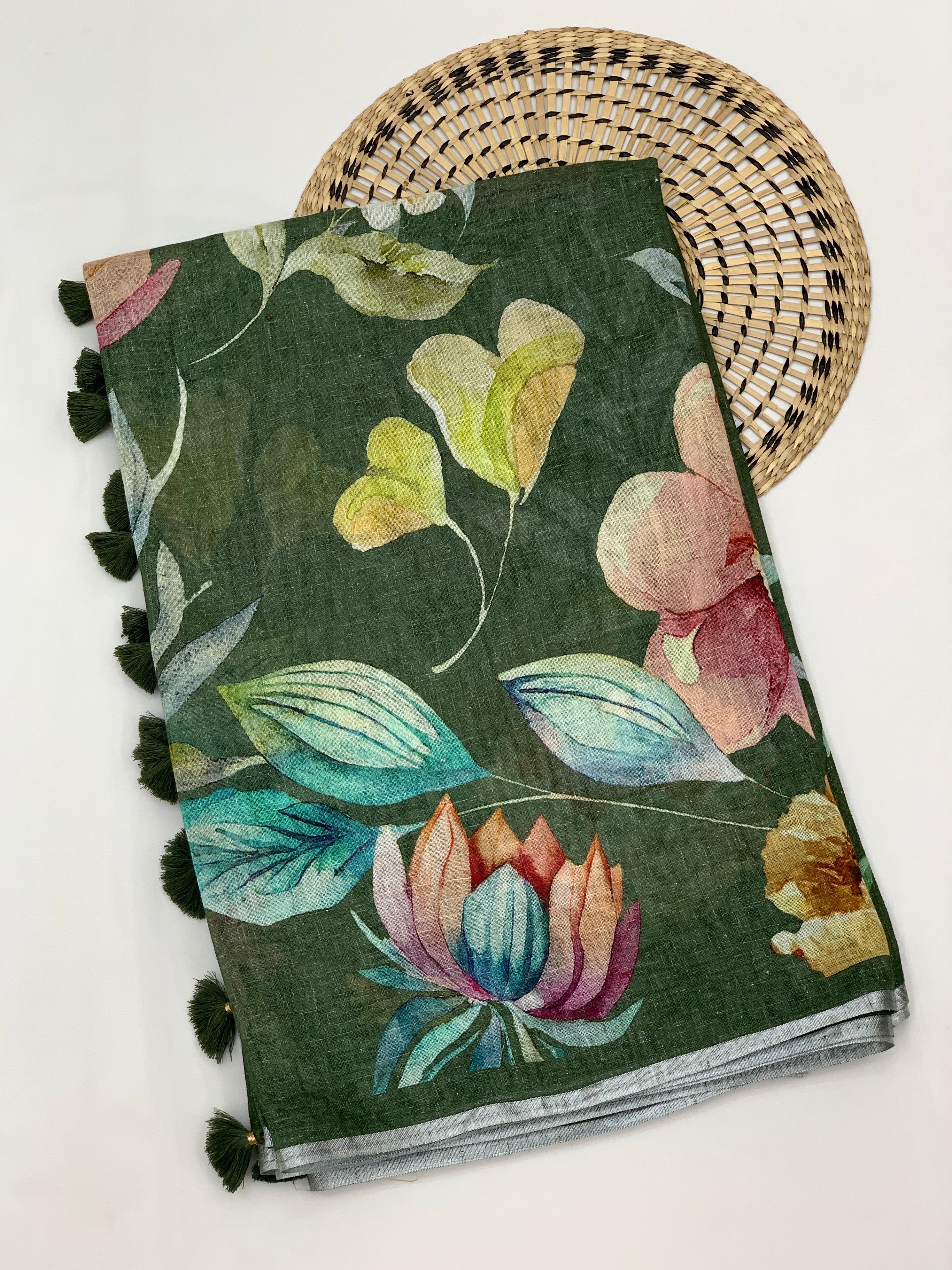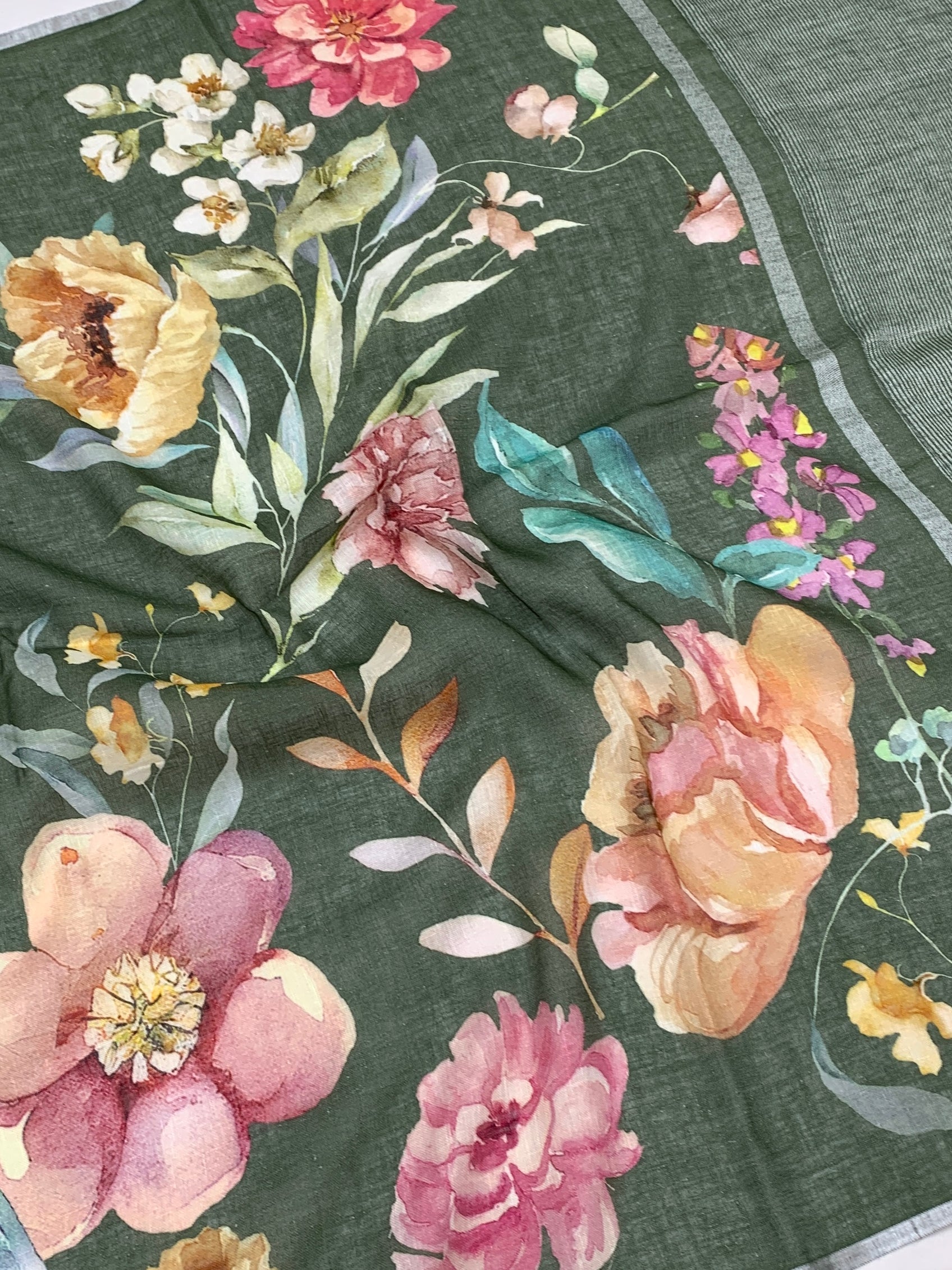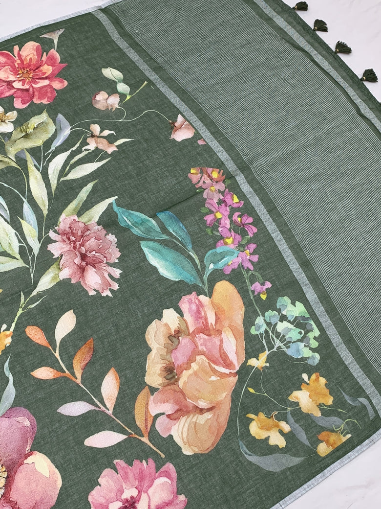 This green Linen Cotton Saree showcases intricate multi-colored floral jal embroidery, reflecting skilled artistry. It is accentuated by a delicate silver zari kaddi border and a sophisticated striped pallu. The coordinating blouse features a subtle geometric design with a fine zari border, completing the refined ensemble.