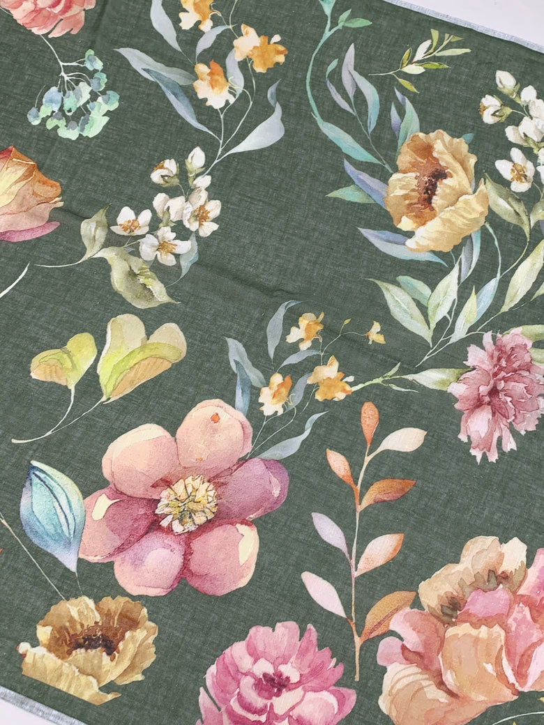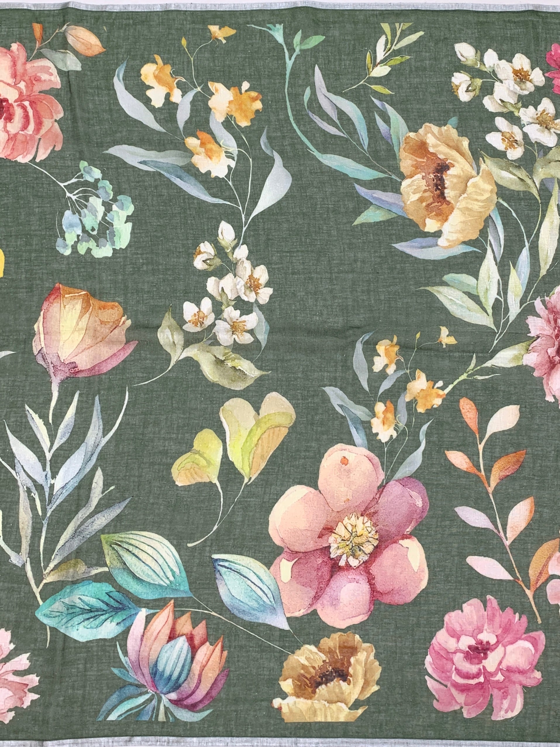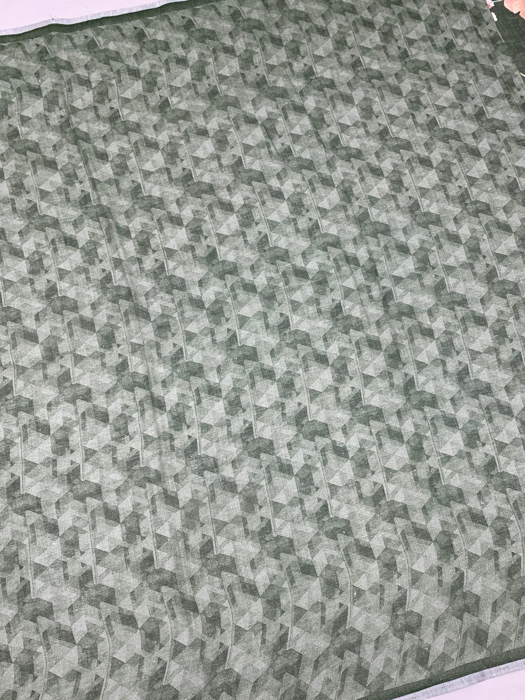 This green Linen Cotton Saree showcases intricate multi-colored floral jal embroidery, reflecting skilled artistry. It is accentuated by a delicate silver zari kaddi border and a sophisticated striped pallu. The coordinating blouse features a subtle geometric design with a fine zari border, completing the refined ensemble.