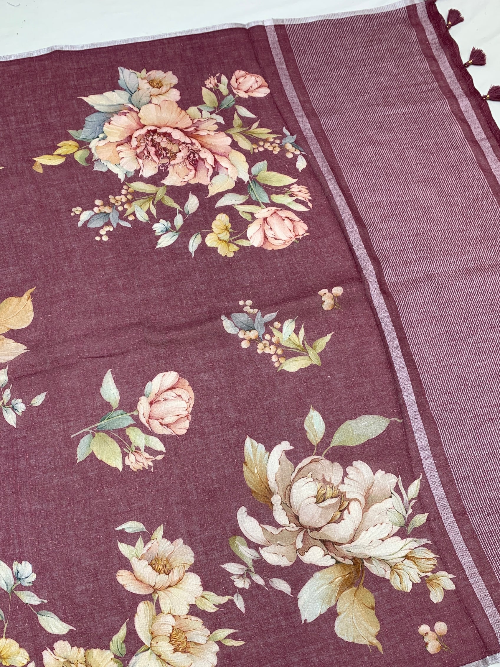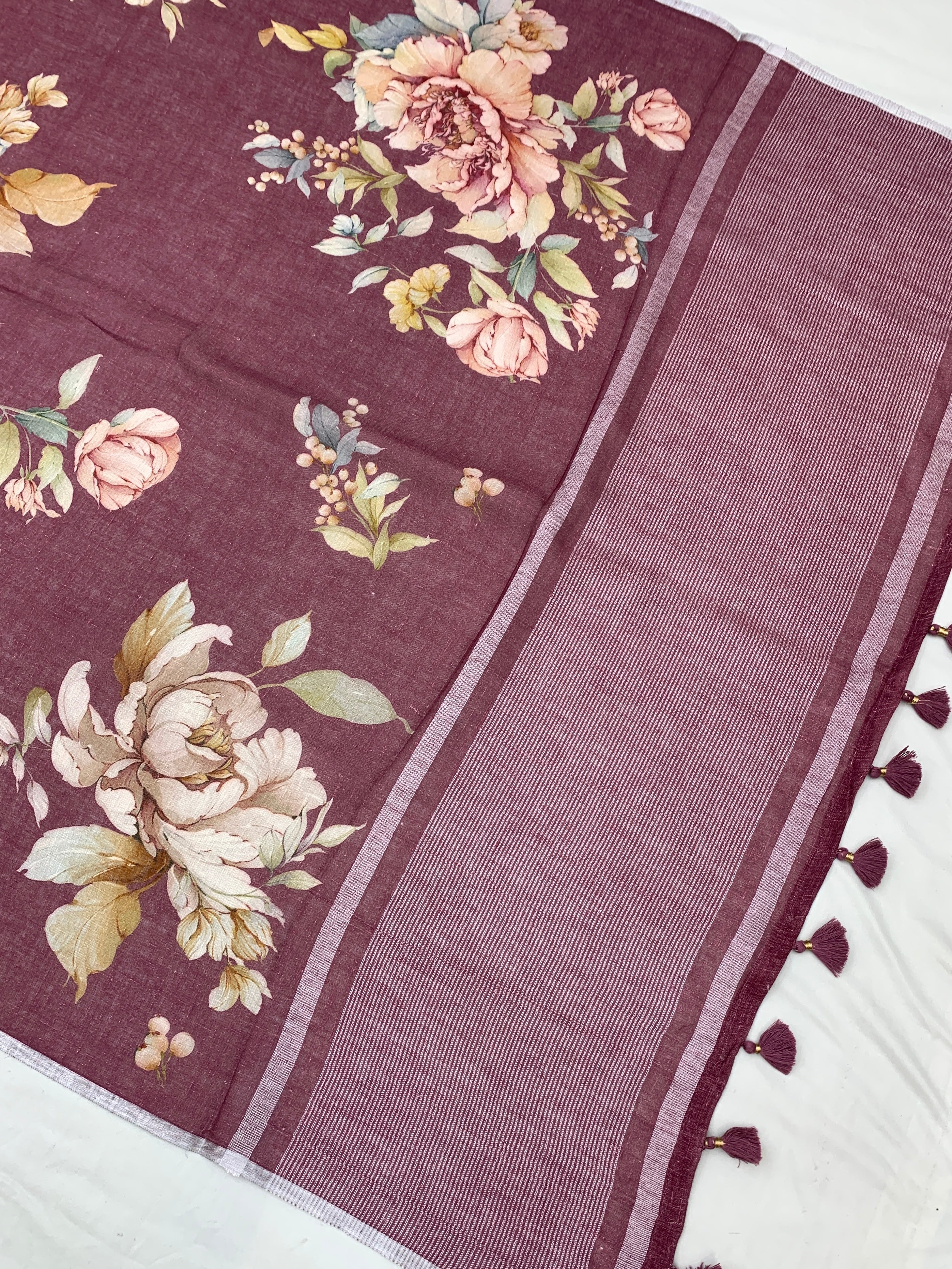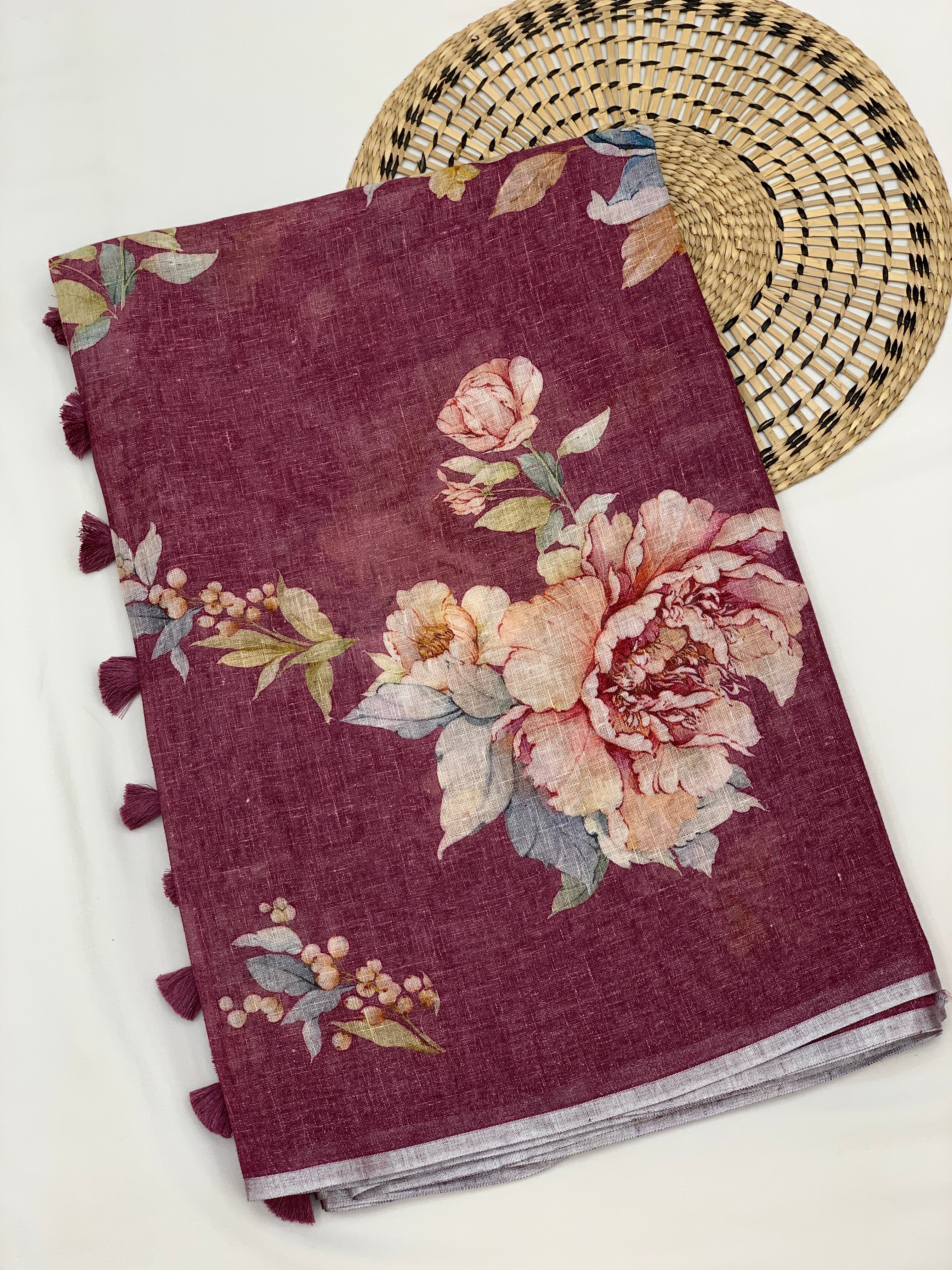 This Linen Cotton Saree in a vibrant Magenta Pink hue highlights detailed multi-colored floral jal embroidery across its fabric. It is adorned with a delicate silver zari small kaddi border and a striped pallu design. The coordinating blouse mirrors the floral jal motif and includes a fine zari border for a refined finish.