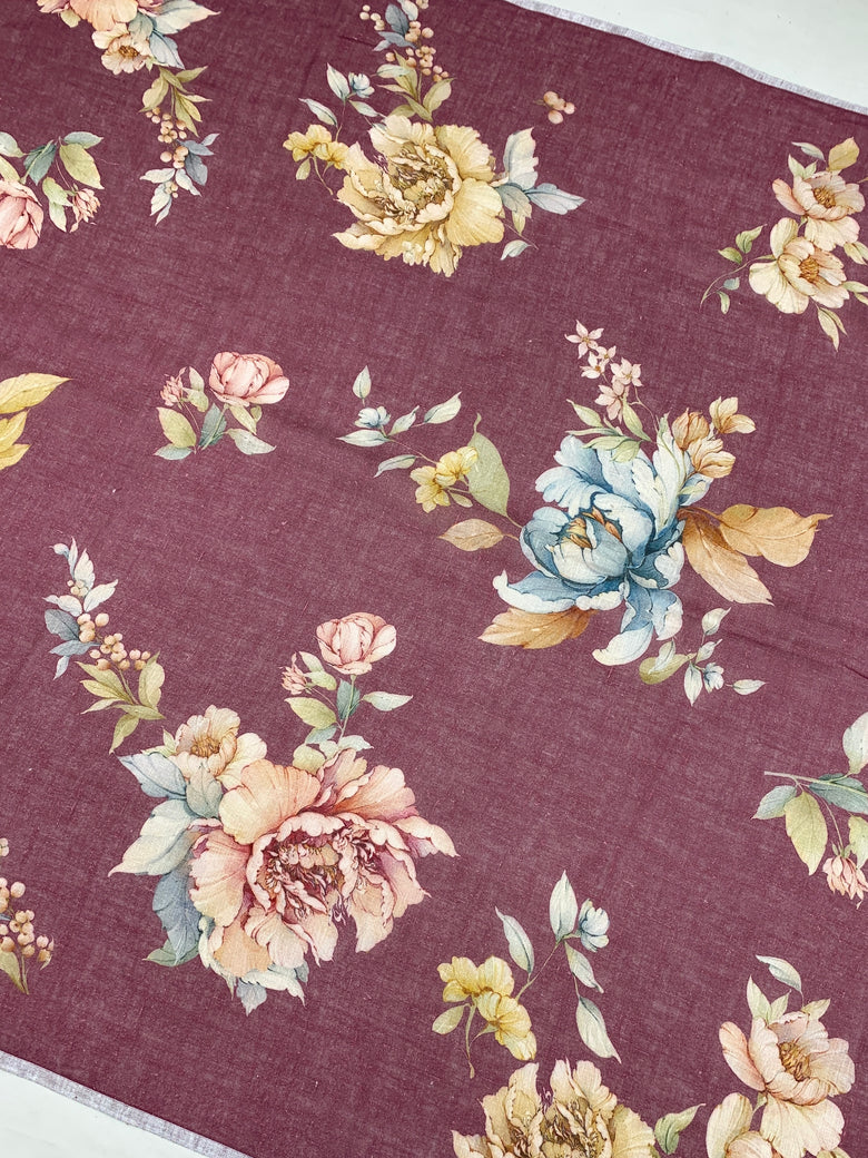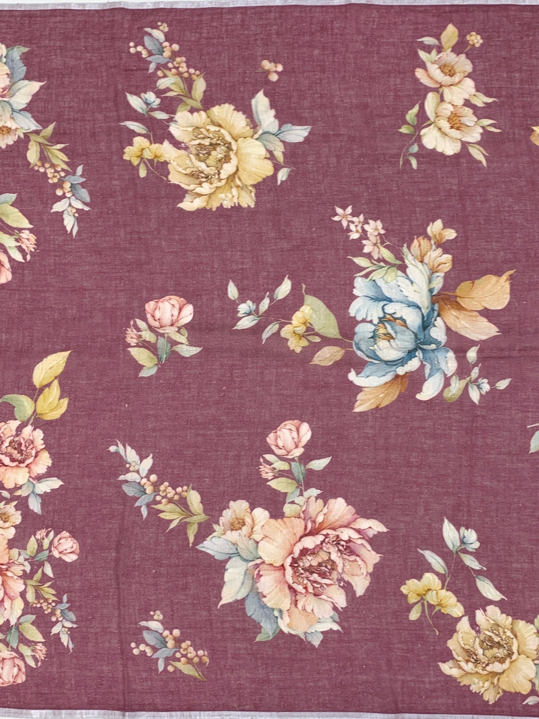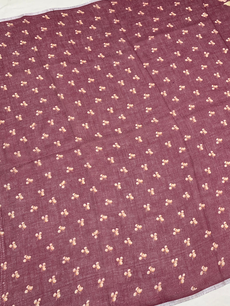 This Linen Cotton Saree in a vibrant Magenta Pink hue highlights detailed multi-colored floral jal embroidery across its fabric. It is adorned with a delicate silver zari small kaddi border and a striped pallu design. The coordinating blouse mirrors the floral jal motif and includes a fine zari border for a refined finish.