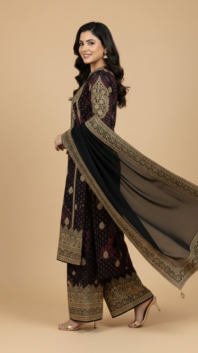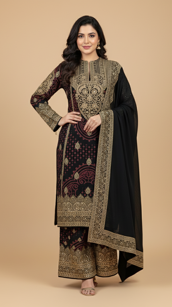 This Satin Majestic Black and Gold Palazzo Suit. An opulent choice for any celebration, featuring heavy gold Zari/Dabka embroidery on a rich black base with subtle maroon Bandhani print. Paired with wide-legged Palazzo pants and a dramatic embroidered dupatta. The ultimate festive statement.