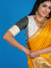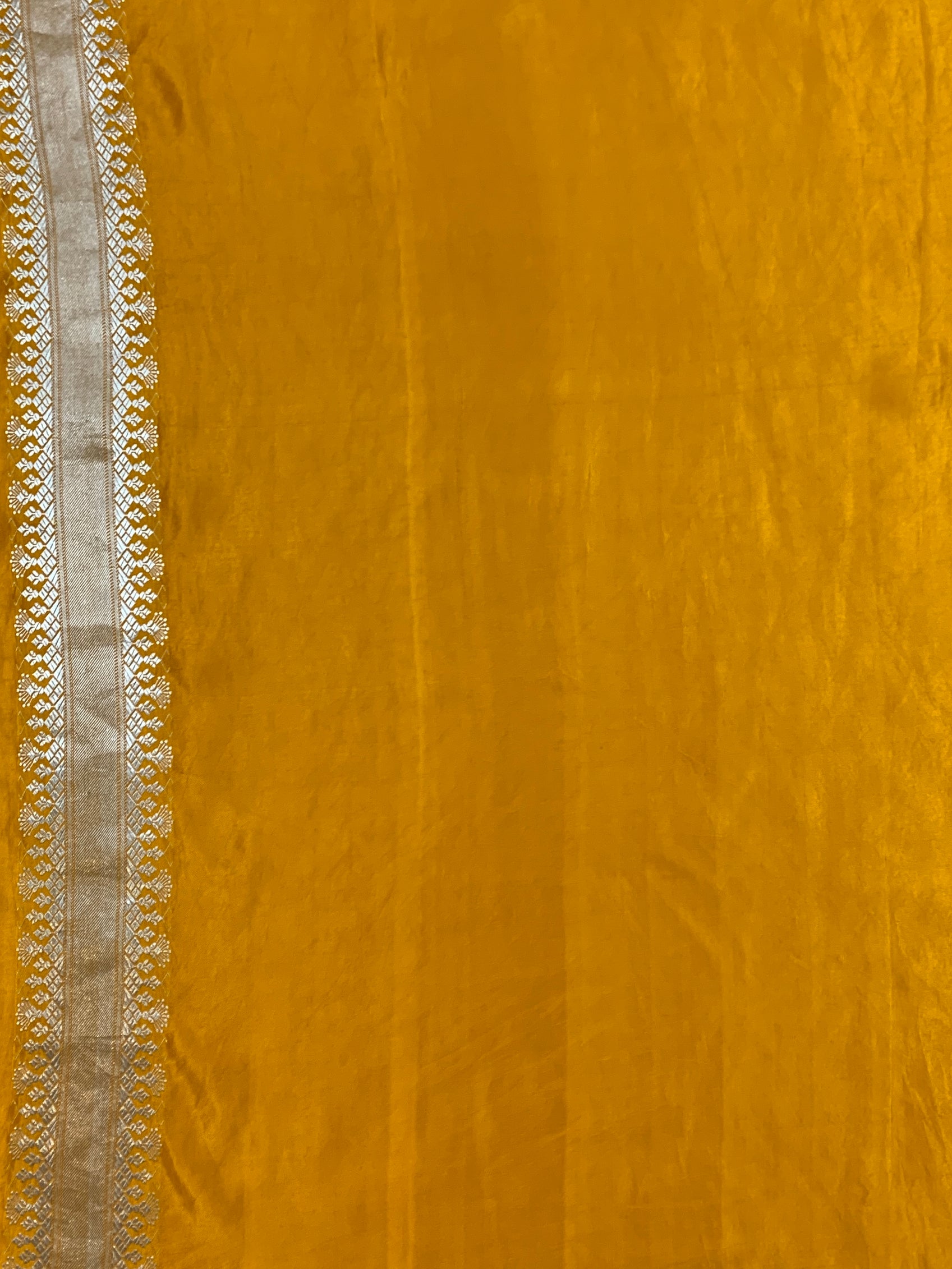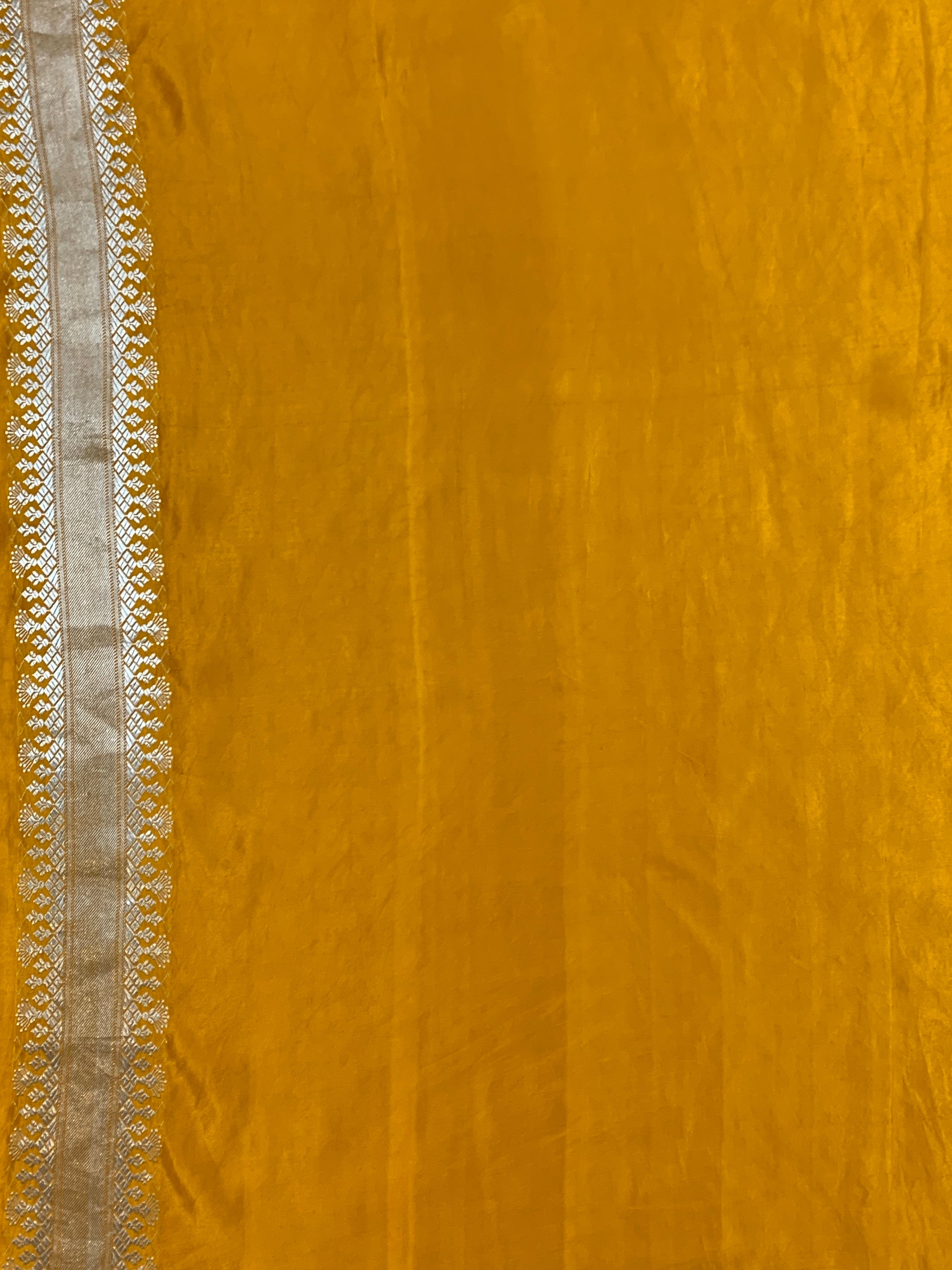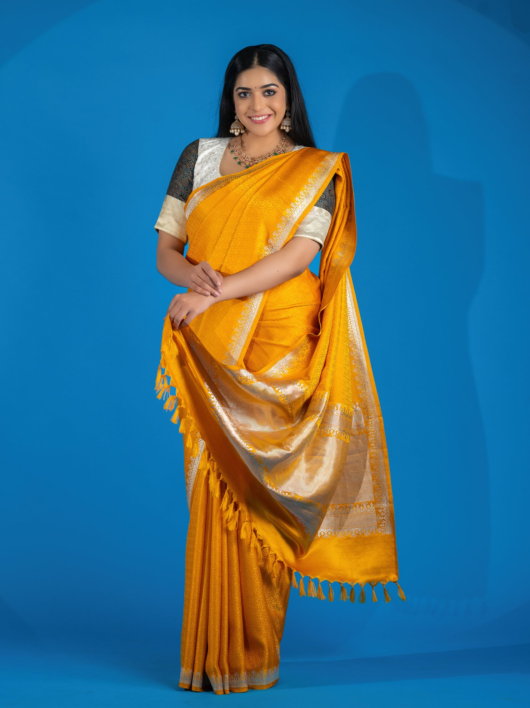This mustard-colored mashru silk saree features an intricate weave of floral thread work throughout the entire saree. It also includes a self floral border and a brocade pallu. Additionally, an unstitched self blouse with zari border.