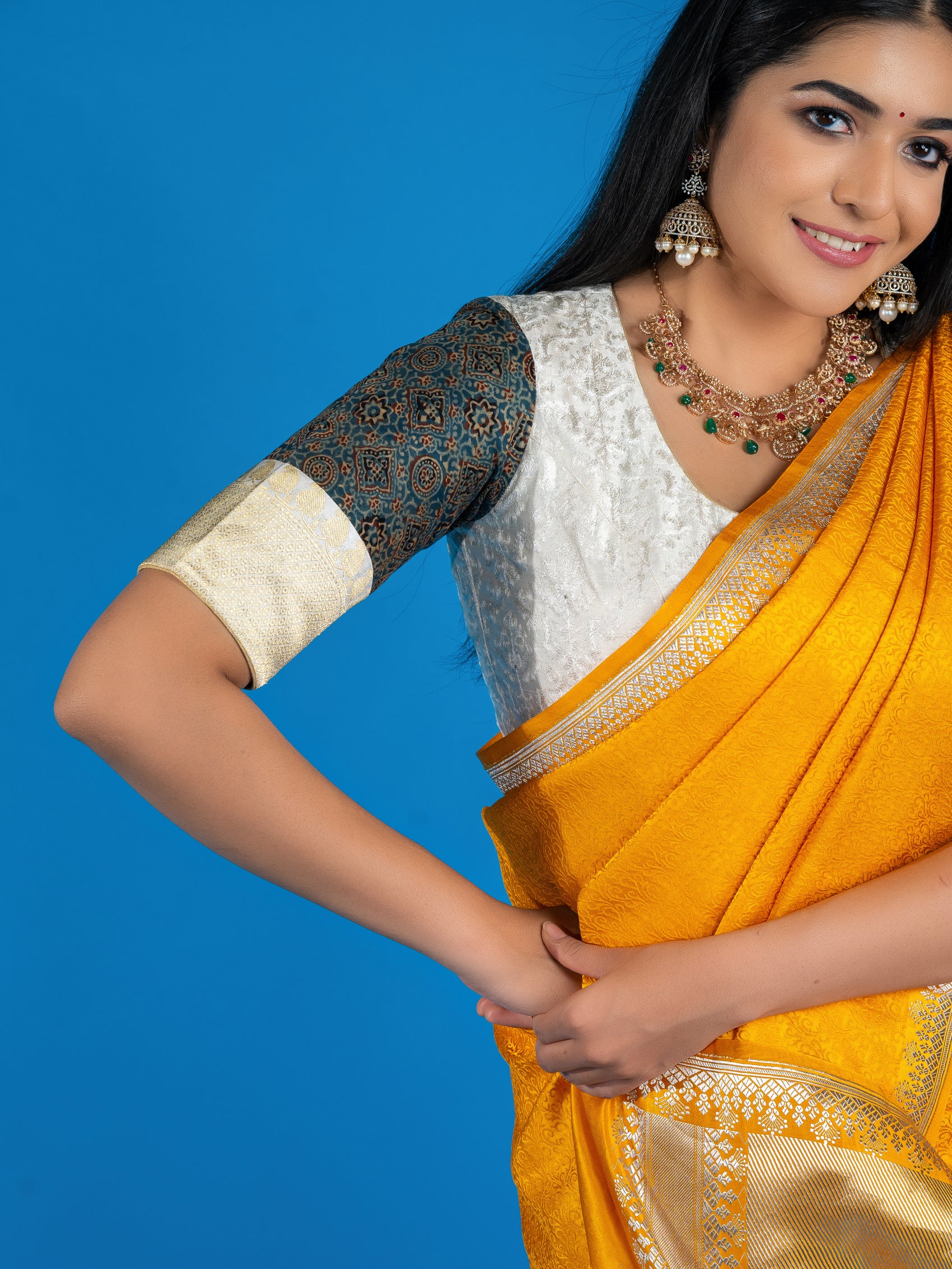 The fusion white colour silk blouse features intricate embroidery and contrasting ajrakh sleeves with a border.