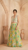 This multi-colour georgette floral lehenga features all-over floral print. The blouse is adorned with self-made pearls and mirrors, while the jacket is made from a net fabric with floral sequins and pearl accents.