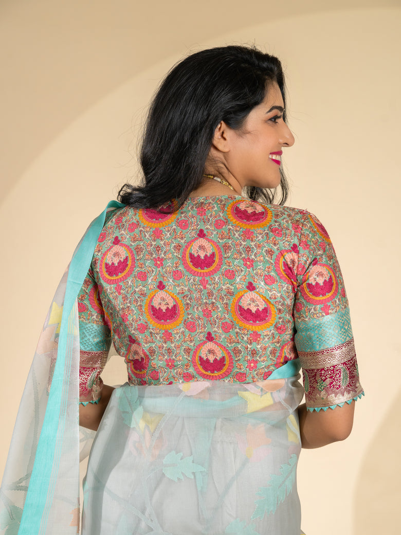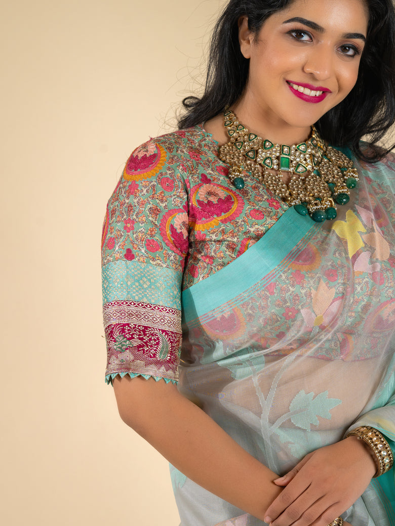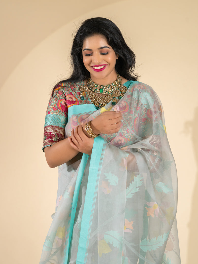 Muslin jamdani saree,all over multi-colour floral jamdani weave on saree, contrast plain border and thread work stripes pallu, colour half-white, you'll receive an unstitched running blouse piece in a contrasting, plain design with a border.
