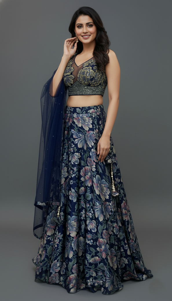 This navy-blue georgette lehenga features a floral print design, self sequins, and a stunning floral blouse with glass bead embellishments. The included dupatta is made of net fabric and features self sequin buttis and a border.