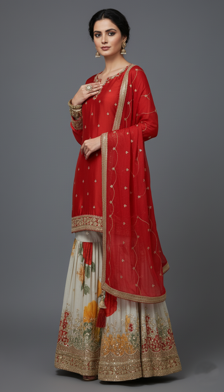 This orange sharara suit is made of satin silk and features intricate embroidery and sequin work on the top, along with contrasting floral print and organza fabric on the bottom. The dupatta is also made of self organza fabric and features a floral pattern with a border.