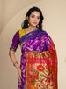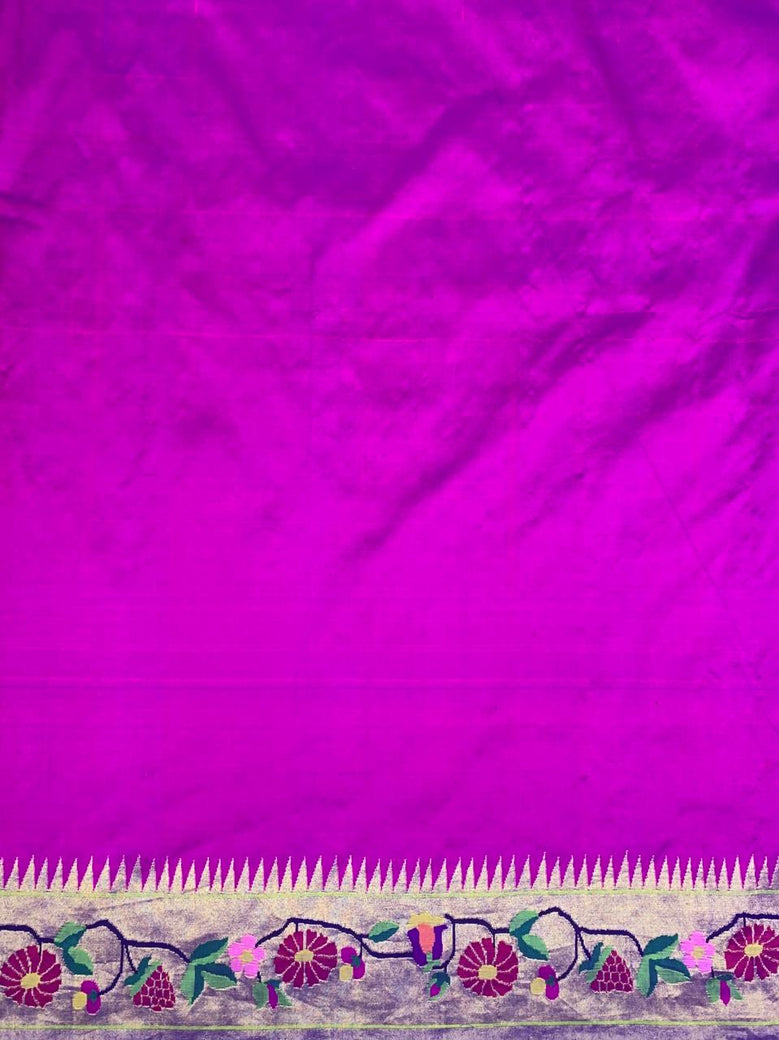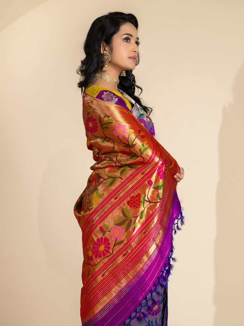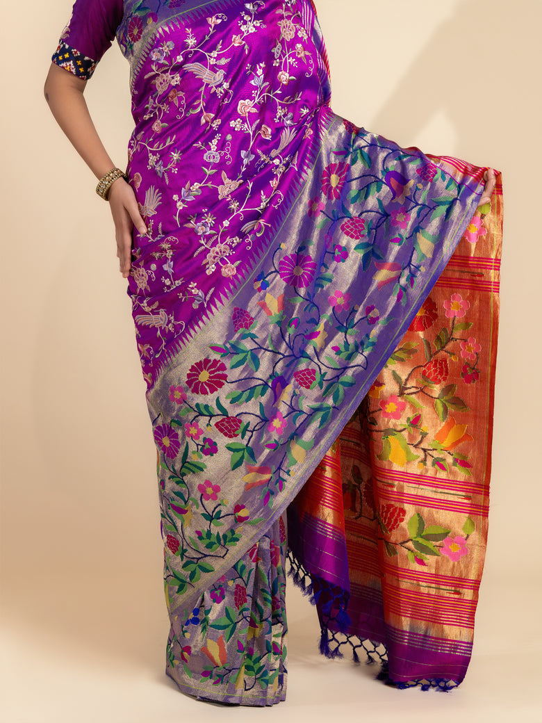 Paithani saree featuring intricate details such as gold zari polka dots, parsi-gara and petite-point work birds motif, and floral jaal all over. The saree is adorned with a self meenakari floral border and pallu. Plus, you'll receive an unstitched running blouse piece with a self design and border to complete the look.