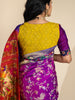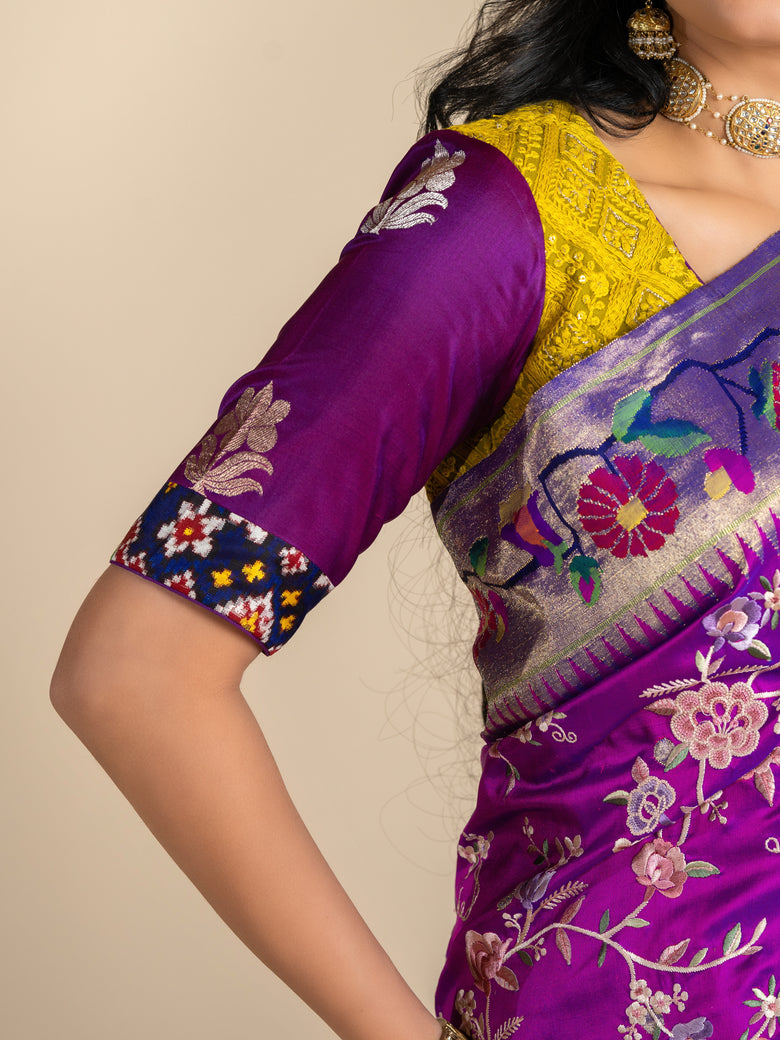 This fusion blouse features intricate chikankari work and showcase a contrast Banarasi Sleeves, finished with a patan patola border for an elegant touch.