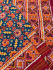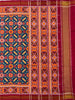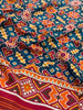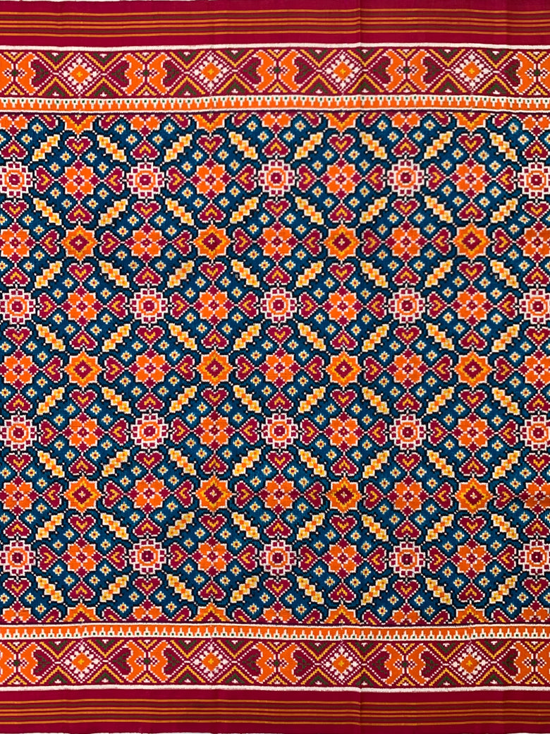 Patan Patola saree boasts an intricate design of multi-color navratan throughout. The teal-blue color adds a touch of sophistication, while the contrasting floral border and pallu lend a unique and eye-catching look. Experience the traditional beauty and expert craftsmanship of Patola sarees with this elegant piece.