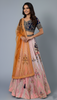 This peach floral lehenga features a hand-embroidered zig-zag pattern with pearl, mirror work, and multi-colored floral buttis. The lehenga is made of georgette and has a secondary color of light pink. It also comes with a contrasting zardozi work blouse and a net fabric dupatta with a laheriya design and border.