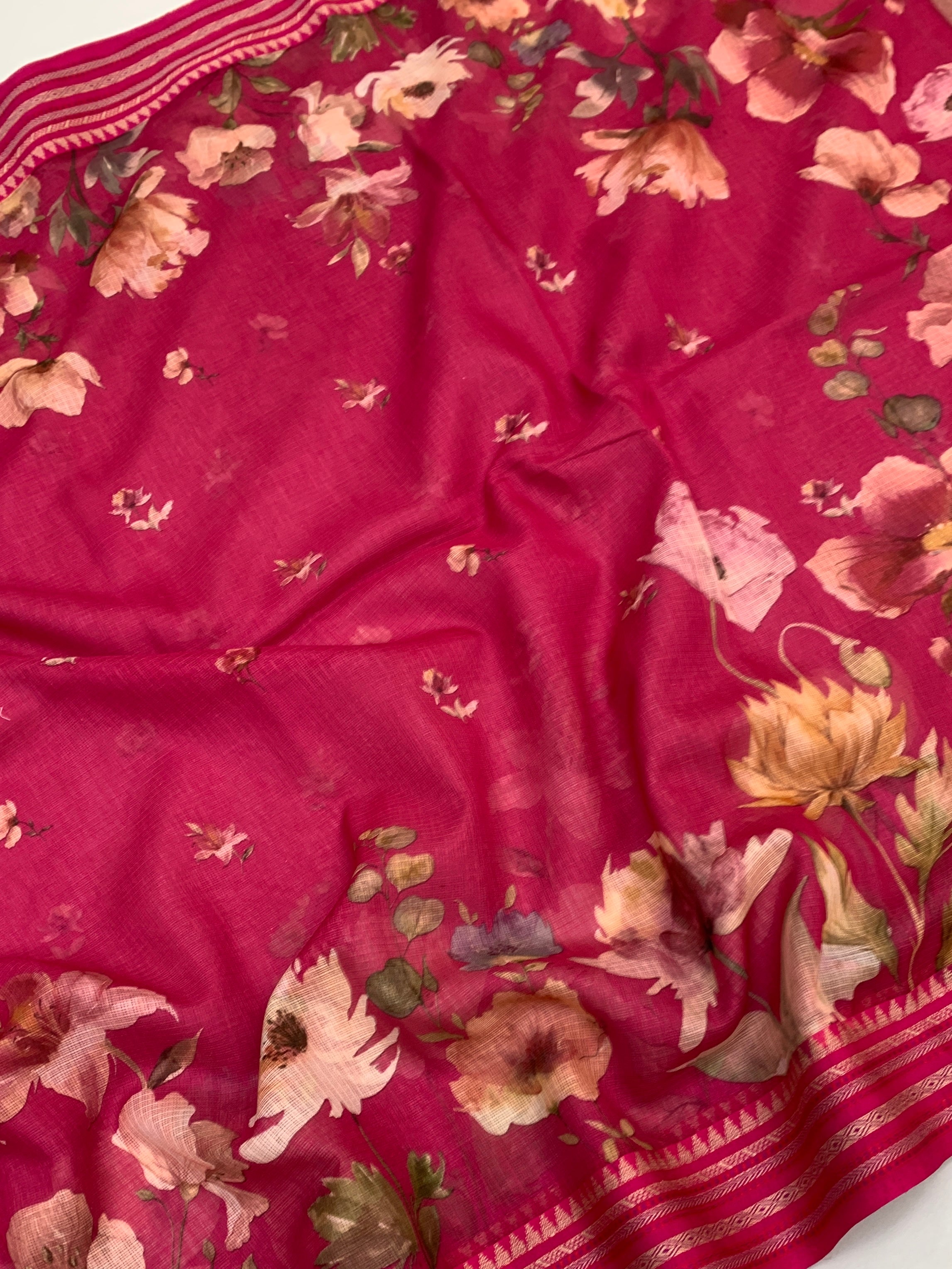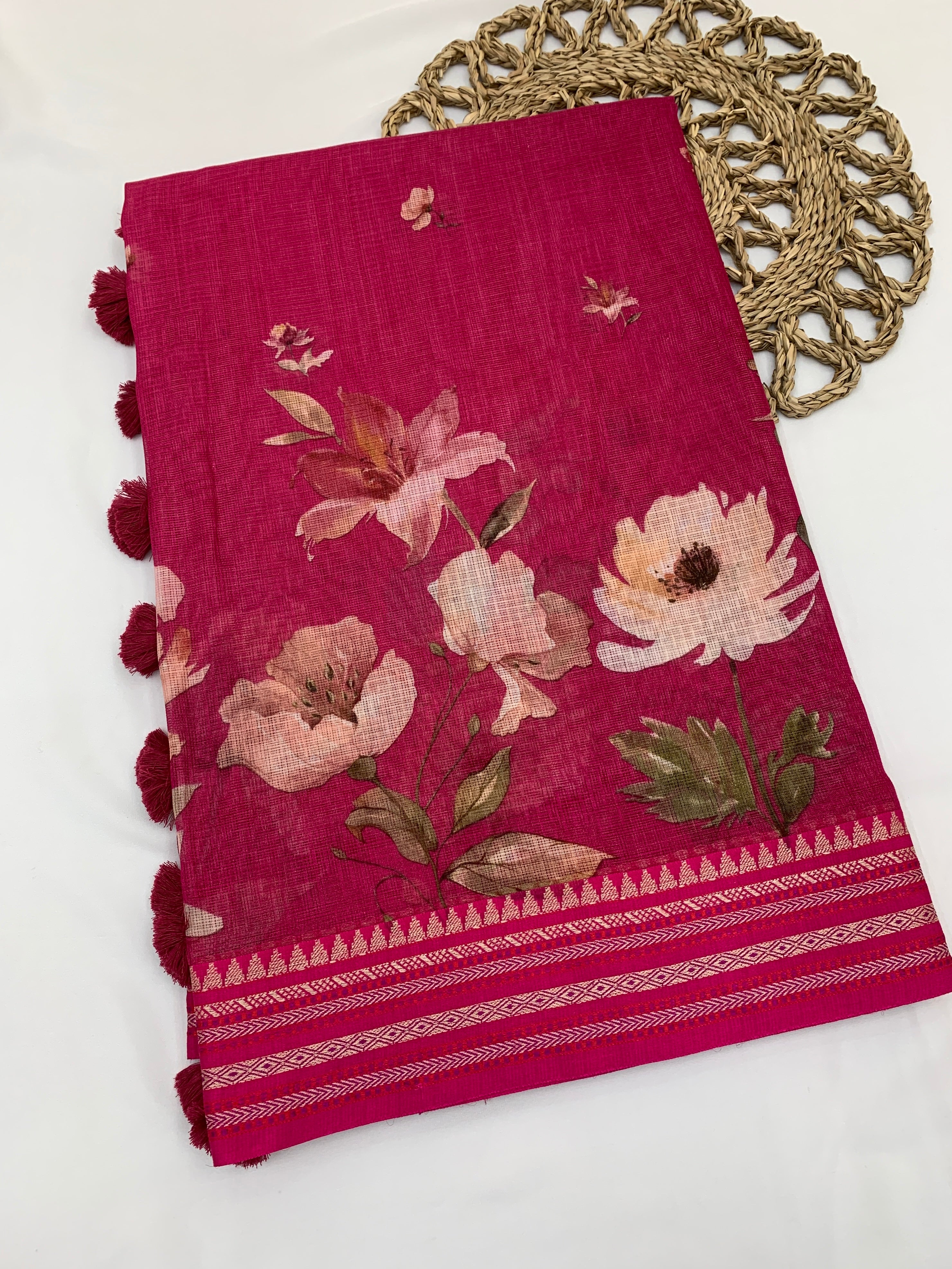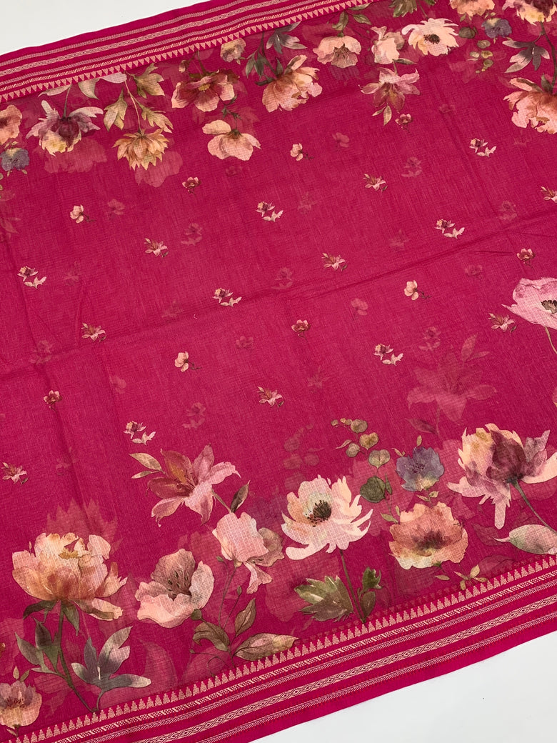 timeless elegance with this exquisite Cotton Kota saree in a rich pink shade, adorned with beautiful floral prints. This stunning piece combines the lightweight comfort of cotton kota with the sophistication of artistic floral designs, creating a saree that's both graceful and effortlessly chic.