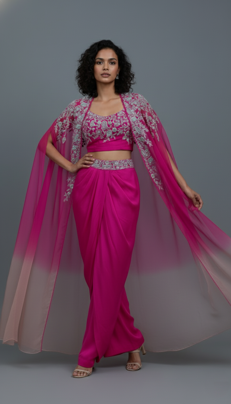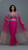 This elegant rani pink silk zari work co-ord set is an ideal ensemble for any special event. It includes a beautifully embroidered organza cape.