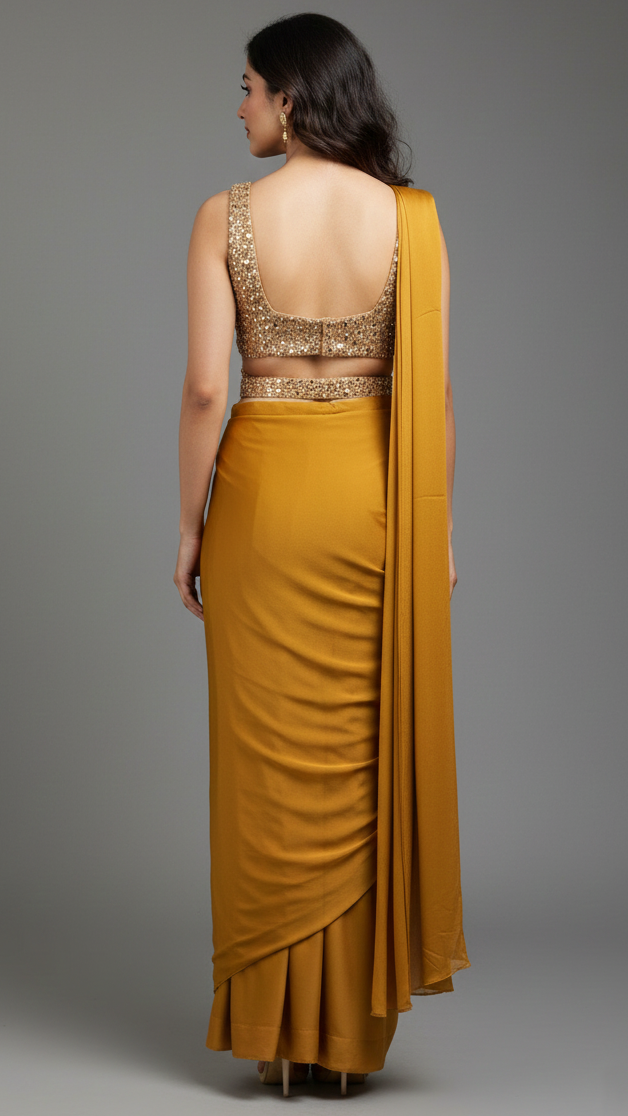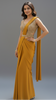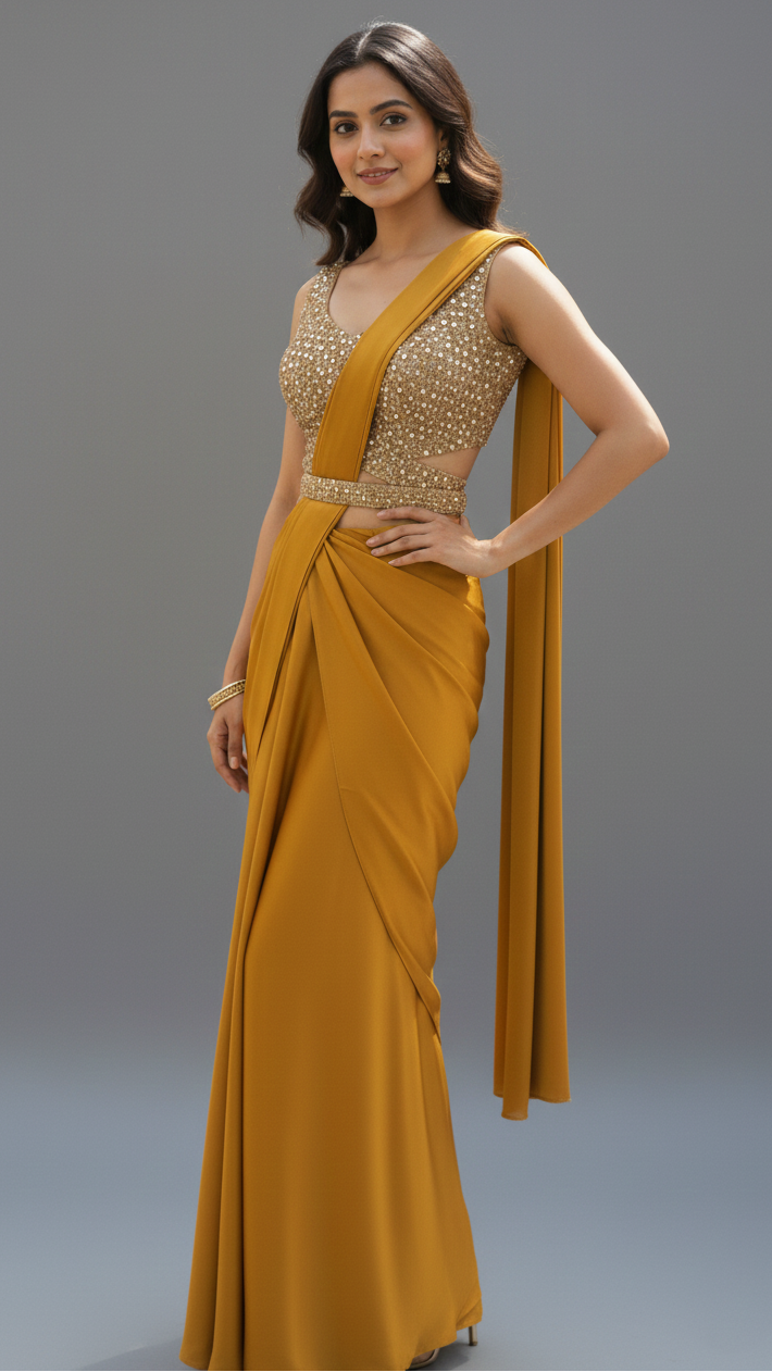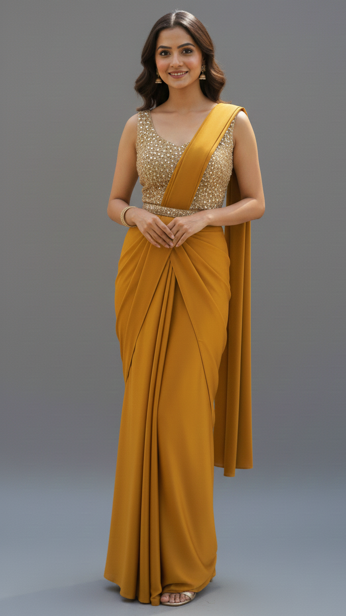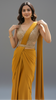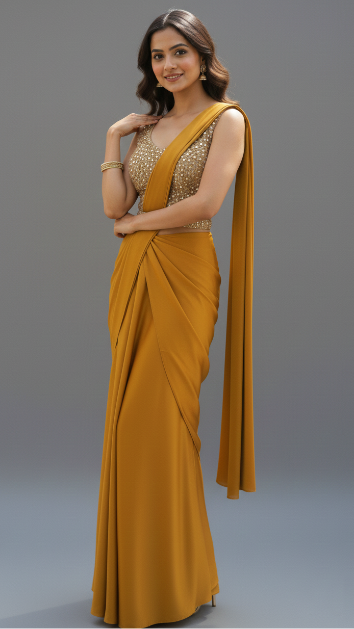 This ready-to-wear saree in satin silk is a stylish choice, with a beautiful mustard color and an intricate plain design. The blouse features self mirror work for added flair.