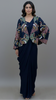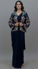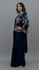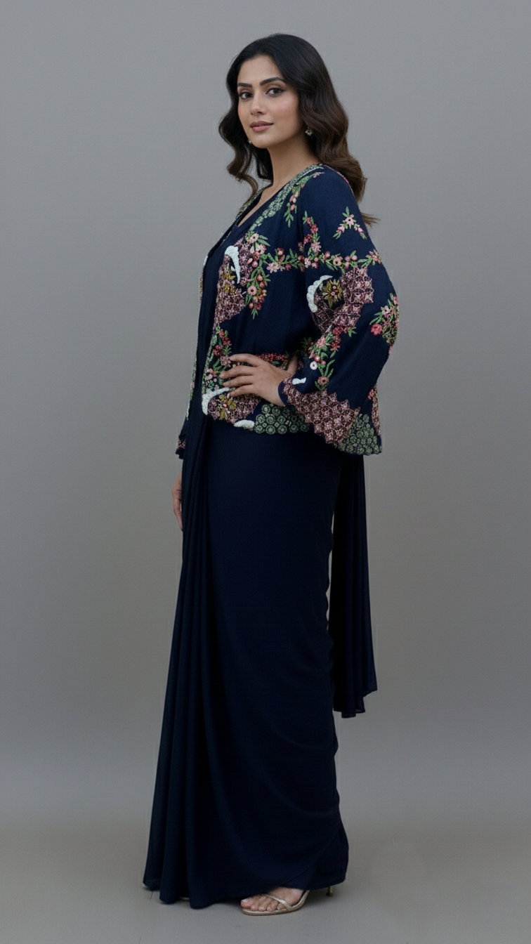 This navy-blue ready to wear saree features a satin silk fabric and an all-over plain design with a floral embroidery border. The blouse is made from self raw-silk fabric, with floral embroidery buttis, while the accompanying jacket is also made from floral embroidery raw-silk fabric.