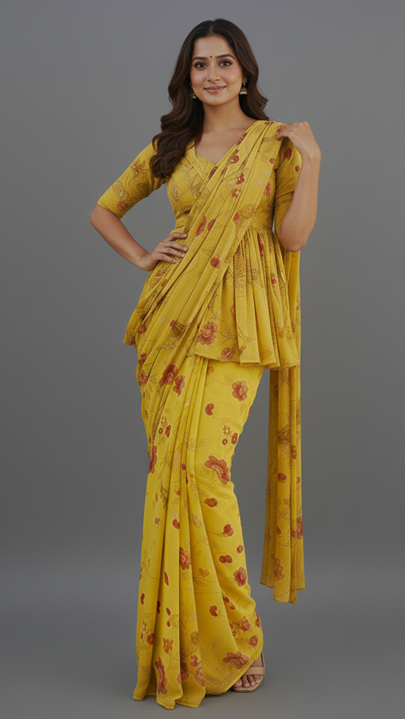 This saree is ready to wear and comes in a vibrant yellow color. It is made of georgette fabric and features an all over floral print, adorned with sequence and glass beads. The self blouse completes the ensemble.