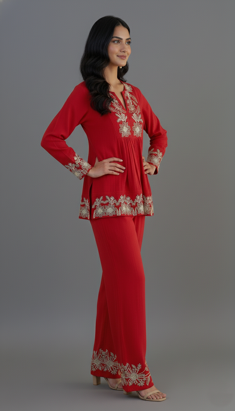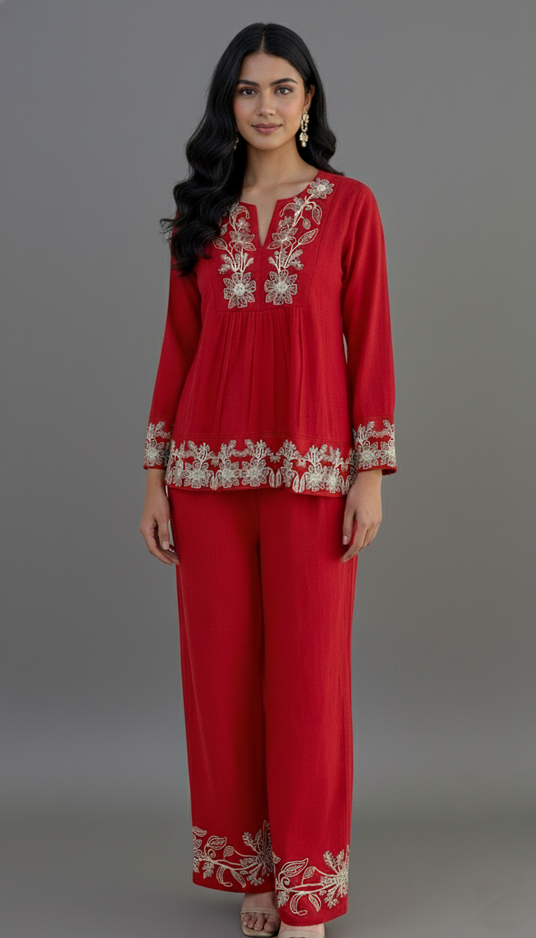 This red cotton co-ord set features a plain weave design with intricate floral embroidery and delicate pearl accents on the border and neckline. The bottom is plain with a complementary border for a cohesive look.