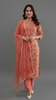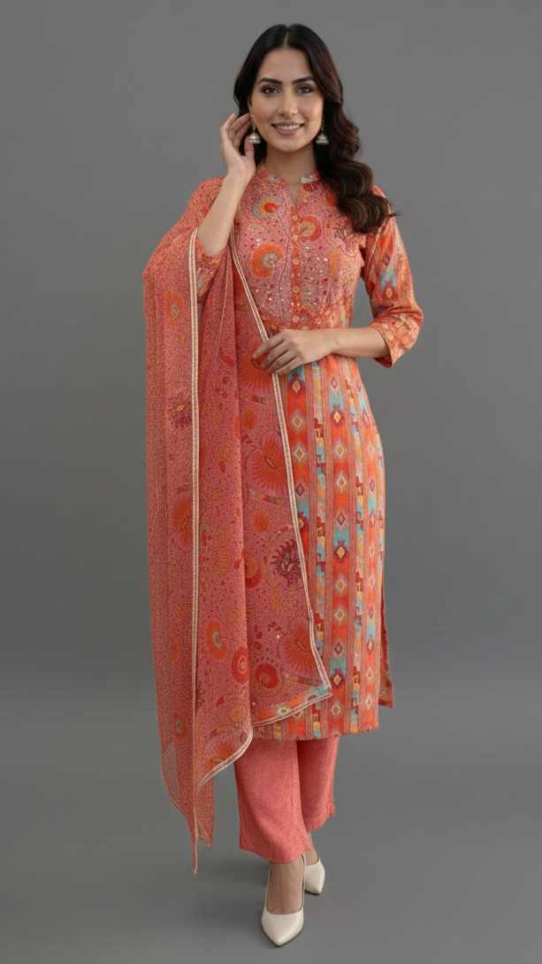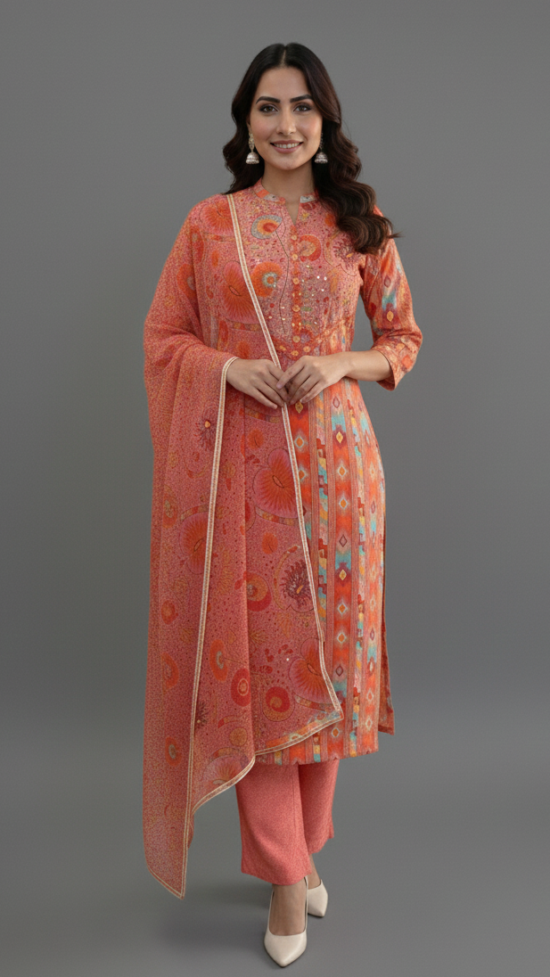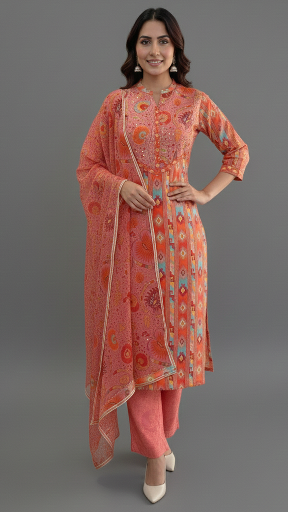 The Silk Straight Cut Set In Multi-Colour showcases a woven and geometric pattern, decorated with mirror, aari, and pearl work buttis. Additionally, the dress boasts a self-floral print on the bottom, while the chiffon dupatta features a floral print and lace border.