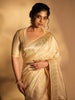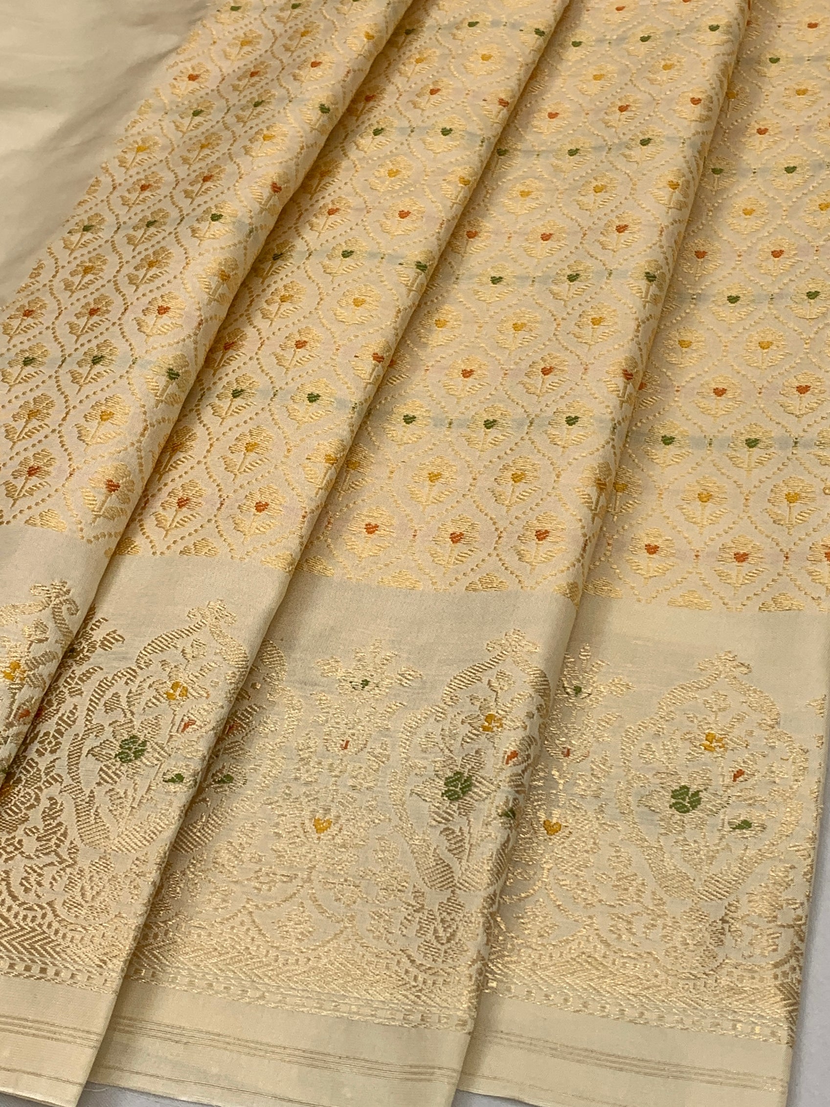 Product Overview: Indulge in the luxury of tradition. This exquisite ivory saree features a rich play of gold zari weave across the body, complemented by a heavy, ornate border. The pallu is a masterpiece of craftsmanship, featuring subtle hints of emerald green that add a contemporary touch to a classic silhouette.