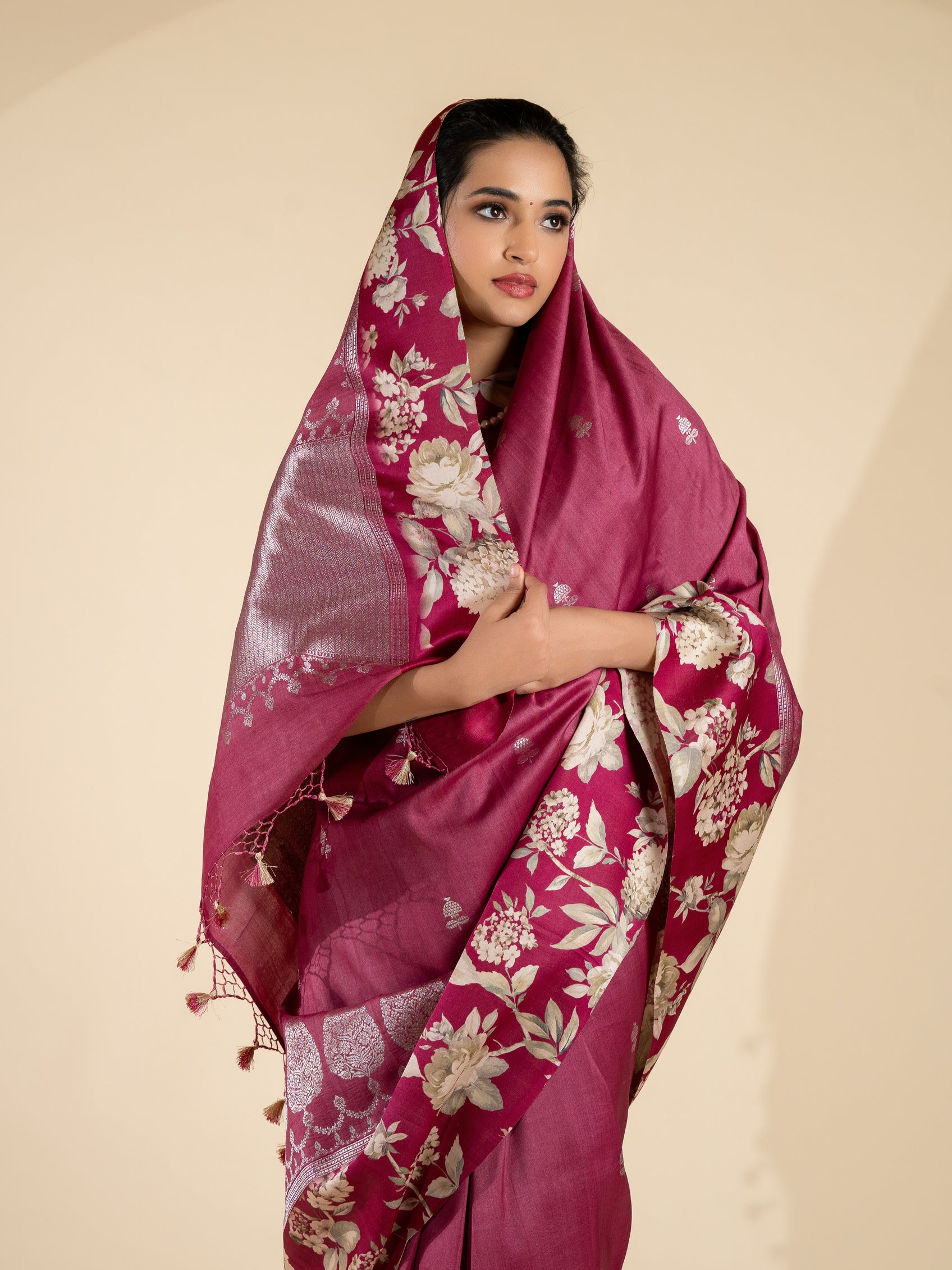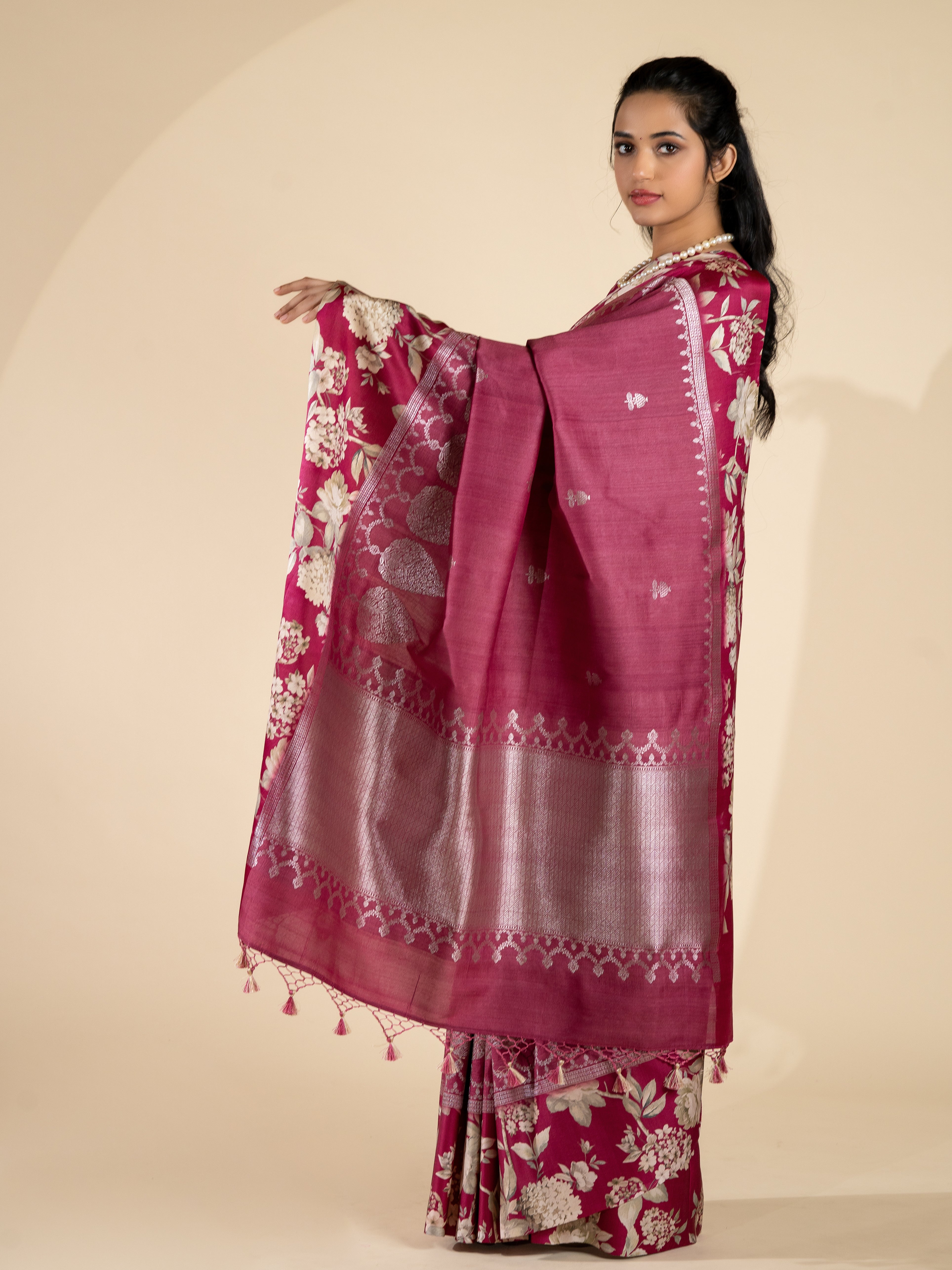 Tussore georgette saree features intricately woven silver zari floral buttis spread throughout the saree. The contrast silk border showcases a beautiful floral print, while the self brocade pallu adds an elegant touch. In a light-maroon color, this saree comes with an unstitched silk blouse in a contrasting floral print with border.