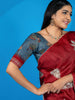 Tussore blouse showcases a stunning kalamkari and features self sleeves with a contrasting vidarbha border.