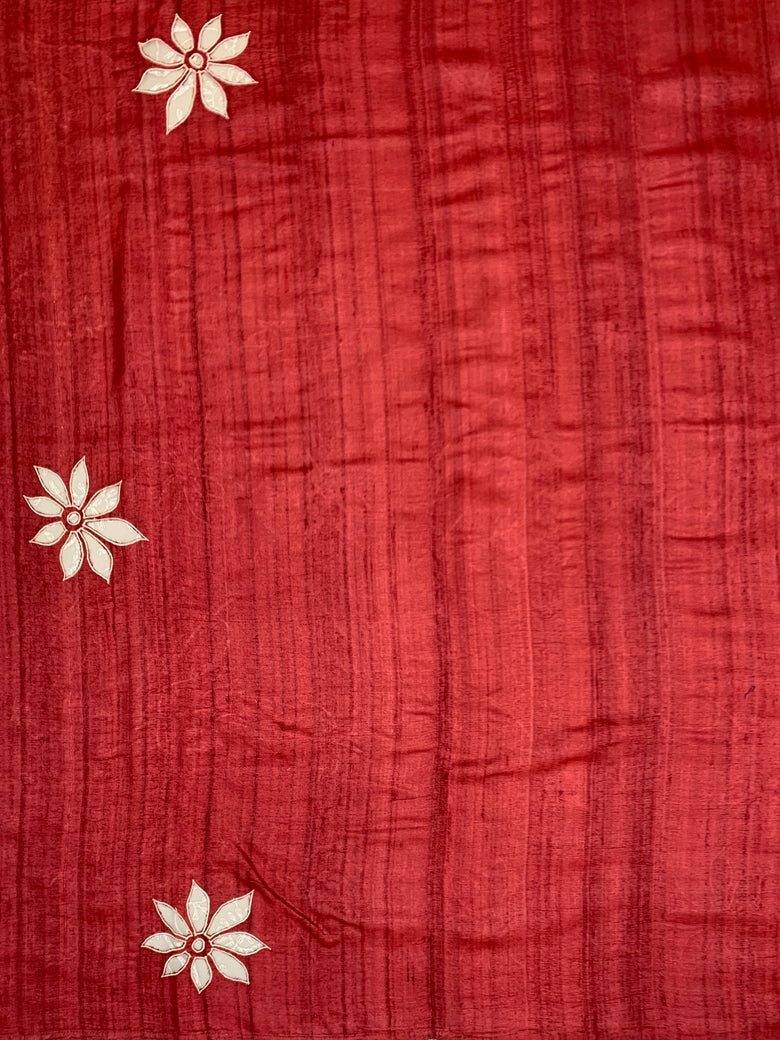 This tussore saree features patchwork embroidery with leaf designs. It also comes with an unstitched blouse in a self, plain design with a border. Get ready to make a statement with this stunning piece.